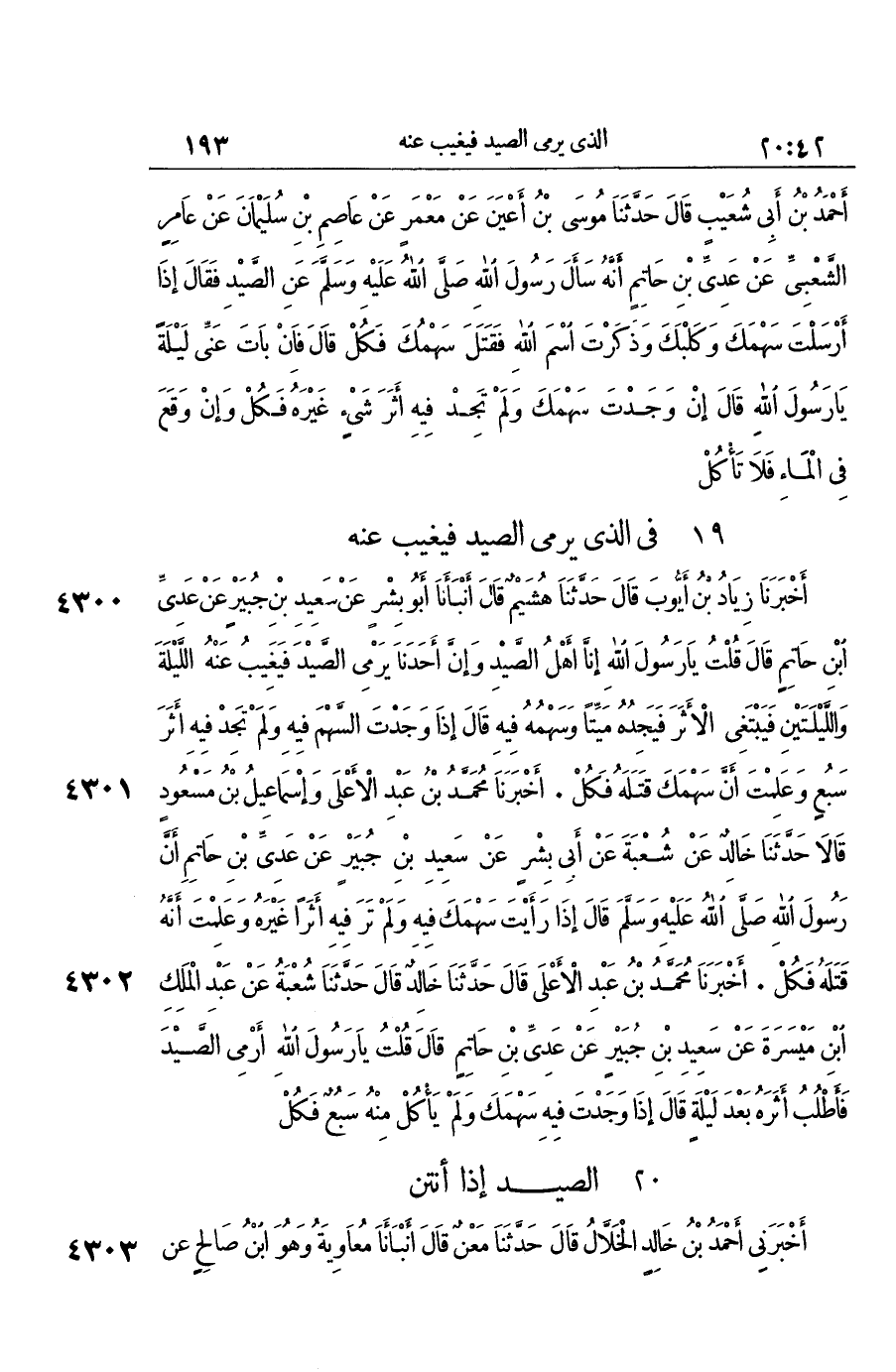 4300 - أَخْبَرَنَا زِيَادُ بْنُ أَيُّوبَ قَالَ: حَدَّثَنَا هُشَيْمٌ قَالَ: أَنْبَأَنَا أَبُو بِشْرٍ، عَنْ سَعِيدِ بْنِ جُبَيْرٍ، عَنْ عَدِيِّ بْنِ حَاتِمٍ قَالَ: قُلْتُ: يَا رَسُولَ اللَّهِ، إِنَّا أَهْلُ الصَّيْدِ وَإِنَّ أَحَدَنَا يَرْمِي الصَّيْدَ فَيَغِيبُ عَنْهُ اللَّيْلَةَ وَاللَّيْلَتَيْنِ فَيَبْتَغِي الْأَثَرَ فَيَجِدُهُ مَيِّتًا وَسَهْمُهُ فِيهِ، قَالَ: «§إِذَا وَجَدْتَ السَّهْمَ فِيهِ، وَلَمْ تَجِدْ فِيهِ أَثَرَ سَبُعٍ، وَعَلِمْتَ أَنَّ سَهْمَكَ قَتَلَهُ فَكُلْ»