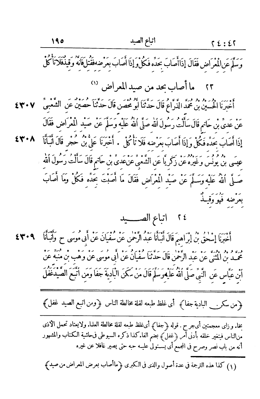 [4309] مَنْ سَكَنَ الْبَادِيَةَ جَفَا أَيْ غَلُظَ طَبْعُهُ لِقِلَّةِ مُخَالَطَةِ النَّاسِ وَمَنِ اتَّبَعَ الصَّيْدَ غَفُلَ بِضَمِّ الْفَاءِ وَمَنِ اتَّبَعَ السُّلْطَانَ افْتُتِنَ أَيْ أَصَابَته فتْنَة الْقَاحَةِ بِالْقَافِ وَحَاءٍ مُهْمَلَةٍ وَصَحَّفَ مَنْ رَوَاهُ بِالْفَاءِ مَوْضِعٌ بَيْنَ مَكَّةَ وَالْمَدِينَةِ عَلَى ثَلَاثِ مراحل مِنْهَا الْمُجَثَّمَةُ بِالْجِيمِ وَالْمُثَلَّثَةِ كُلُّ حَيَوَانٍ يُنْصَبُ وَيُرْمَى لِيُقْتَلَ إِلَّا أَنَّهَا تَكْثُرُ فِي الطَّيْرِ وَالْأَرَانِبِ وَأَشْبَاهِ ذَلِكَ مِمَّا يَجْثِمُ بِالْأَرْضِ أَيْ يَلْزَمُهَا وَيَلْتَصِقُ بِهَا وَجَثَمَ الطَّائِرُ جُثُومًا وَهُوَ بِمَنْزِلَةِ البروك لِلْإِبِلِ وَشِيقَةً بِفَتْحِ الْوَاوِ وَكَسْرِ الشِّينِ الْمُعْجَمَةِ وَقَافٍ هِيَ أَنْ يُؤْخَذَ اللَّحْمُ فَيُغْلَى قَلِيلًا وَلَا يُنْضَجَ وَيُحْمَلَ فِي الْأَسْفَارِ وَقِيلَ هِيَ الْقَدِيدُ وَقد وَشقت اللَّحْم وأشقته وَتجمع على وشق ووشاق