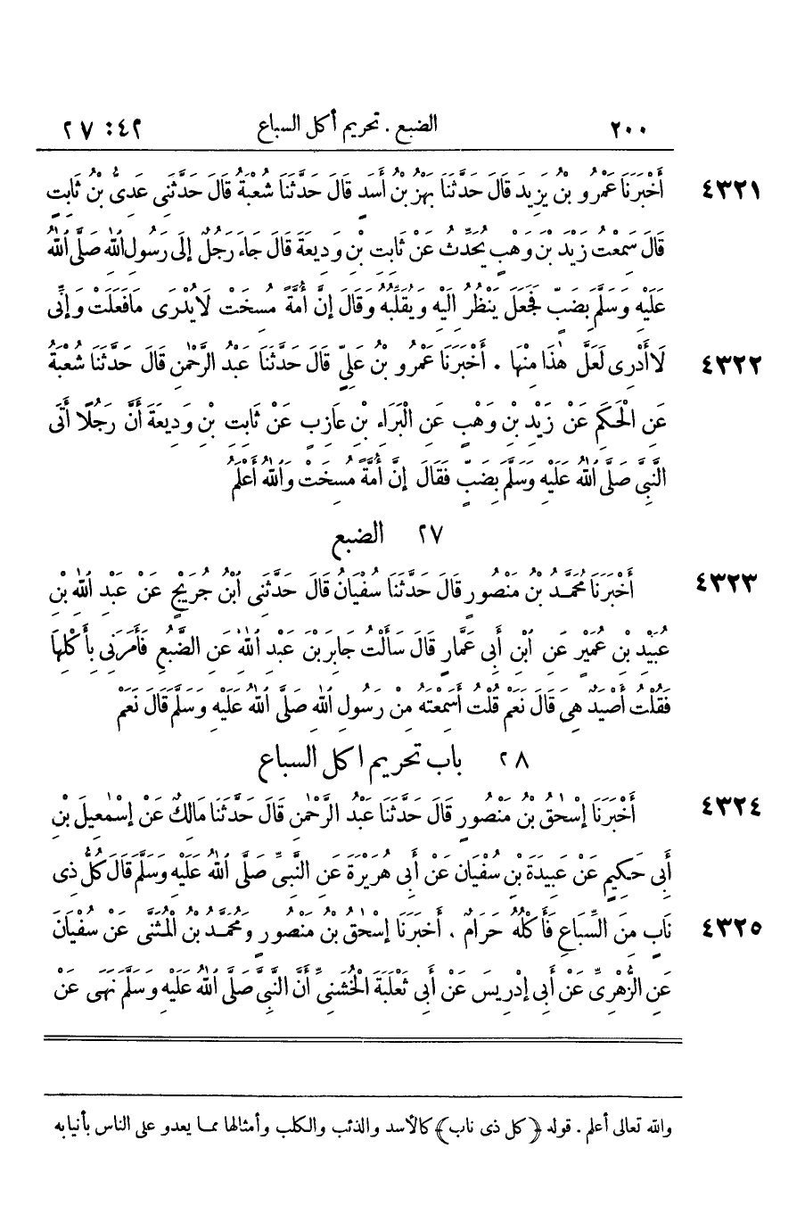 [4324] كل ذِي نَاب كالأسد وَالذِّئْب وَالْكَلب وأمثالها مِمَّا يعدو على النَّاس بأنيابه والناب السن الَّذِي خلف الرّبَاعِيّة قَوْله