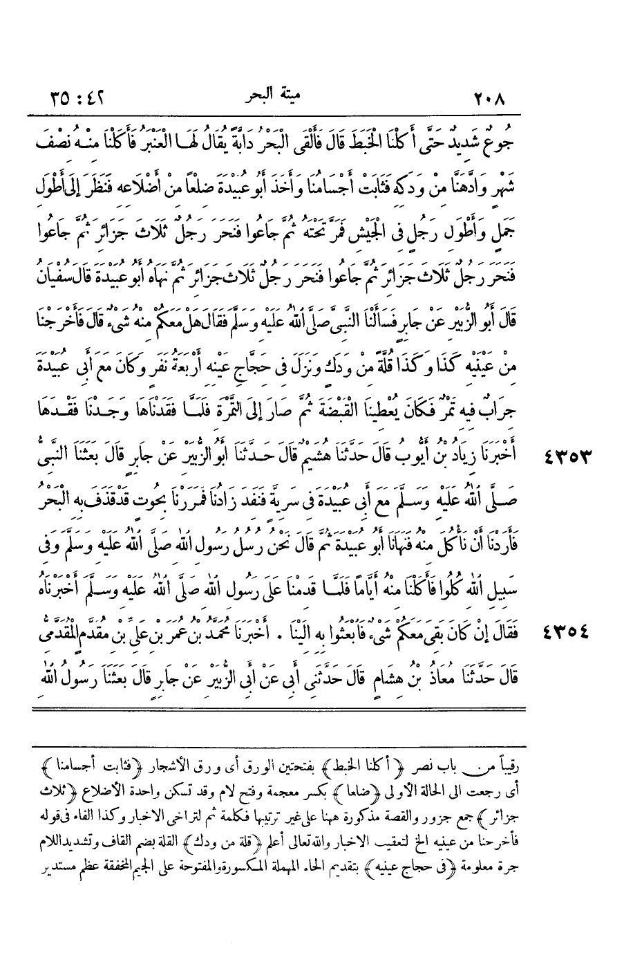 [4352] نرصد عير قُرَيْش من رصد إِذا قعد لَهُ على طَرِيقه رقيبا من بَاب نصر أكلنَا الْخبط بِفتْحَتَيْنِ الْوَرق أَي ورق الْأَشْجَار فثابت أجسامنا أَي رجعت إِلَى الْحَالة الأولى ضلعا بِكَسْر مُعْجمَة وَفتح لَام وَقد تسكن وَاحِدَة الأضلاع ثَلَاث جزائر جمع جزور والقصة مَذْكُورَة هَا هُنَا على غير ترتيبها فكلمة ثمَّ لتراخي الاخبار وَكَذَا الْفَاء فِي قَوْله فأخرجنا من عَيْنَيْهِ الخ لتعقيب الاخبار وَالله تَعَالَى أعلم قلَّة من ودك الْقلَّة بِضَم الْقَاف وَتَشْديد اللَّام جرة مَعْلُومَة فِي حجاج عَيْنَيْهِ بِتَقْدِيم الْحَاء الْمُهْملَة الْمَكْسُورَة والمفتوحة على الْجِيم المخففة عظم مستدير