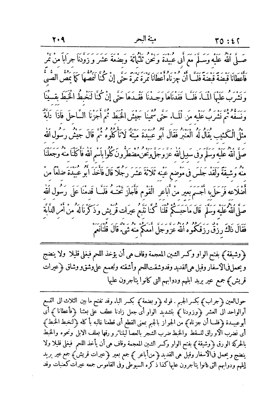حول الْعين جراب بِكَسْر الْجِيم قَوْله وَبضْعَة بِكَسْر الْبَاء وَقد تفتح مَا بَين الثَّلَاث إِلَى التسع أَو الْوَاحِد إِلَى الْعشْر وزودنا بتَشْديد الْوَاو أَي جعل زادنا عطف على بعثنَا فأعطانا أَي أَبُو عُبَيْدَة فَلَمَّا أَن جزناه من الْجَوَاز بِالْجِيم بِمَعْنى الْقطع أَي قَطعنَا غالبه بِأَكْلِهِ لنخبط الْخبط أَي نضرب الأوراق لتسقط والخبط ضرب الشّجر بالعصا ليتناثر وَرقهَا بعلف الْإِبِل وَنَحْوه والخبط بالحركة الْوَرق وَشِيقَةً بِفَتْحِ الْوَاوِ وَكَسْرِ الشِّينِ الْمُعْجَمَةِ وَقَافٍ هِيَ أَن يَأْخُذ اللَّحْمُ فَيُغْلَى قَلِيلًا وَلَا يُنْضَجَ وَيُحْمَلَ فِي الْأَسْفَار وَقيل هِيَ القديد من أباعر جمع بعير عِيرَاتِ قُرَيْشٍ جَمْعُ عِيرٍ يُرِيدُ إِبِلَهُمْ وَدَوَابَّهُمُ الَّتِي كَانُوا يتاجرون عَلَيْهَا كَذَا ذكره السُّيُوطِيّ وَفِي الْقَامُوس جمعه عيرات كعنبات وَقد
