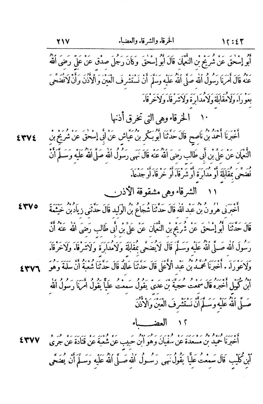 4375 - أَخْبَرَنِي هَارُونُ بْنُ عَبْدِ اللَّهِ قَالَ: حَدَّثَنَا شُجَاعُ بْنُ الْوَلِيدِ قَالَ: حَدَّثَنِي زِيَادُ بْنُ خَيْثَمَةَ قَالَ: حَدَّثَنَا أَبُو إِسْحَاقَ، عَنْ شُرَيْحِ بْنِ النُّعْمَانِ، عَنْ عَلِيِّ بْنِ أَبِي طَالِبٍ رَضِيَ اللَّهُ عَنْهُ، أَنَّ رَسُولَ اللَّهِ صَلَّى اللهُ عَلَيْهِ وَسَلَّمَ قَالَ: «§لَا يُضَحَّى بِمُقَابَلَةٍ، وَلَا مُدَابَرَةٍ، وَلَا شَرْقَاءَ، وَلَا خَرْقَاءَ، وَلَا عَوْرَاءَ»