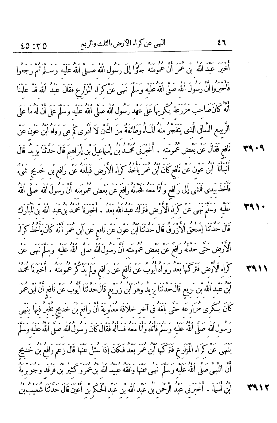 3909 - أَخْبَرَنِي مُحَمَّدُ بْنُ إِسْمَاعِيلَ بْنِ إِبْرَاهِيمَ، قَالَ: حَدَّثَنَا يَزِيدُ، قَالَ: أَنْبَأَنَا ابْنُ عَوْنٍ، عَنْ نَافِعٍ، كَانَ ابْنُ عُمَرَ يَأْخُذُ كِرَاءَ الْأَرْضِ، فَبَلَغَهُ، عَنْ رَافِعِ بْنِ خَدِيجٍ شَيْءٌ، فَأَخَذَ بِيَدِي فَمَشَى إِلَى رَافِعٍ وَأَنَا مَعَهُ، فَحَدَّثَهُ رَافِعٌ، عَنْ بَعْضِ عُمُومَتِهِ، «أَنَّ رَسُولَ اللَّهِ صَلَّى اللهُ عَلَيْهِ وَسَلَّمَ §نَهَى عَنْ كِرَاءِ الْأَرْضِ» فَتَرَكَ عَبْدُ اللَّهِ بَعْدُ