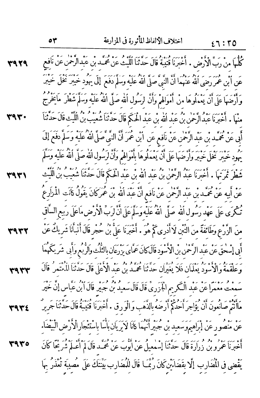 3929 - أَخْبَرَنَا قُتَيْبَةُ، قَالَ: حَدَّثَنَا اللَّيْثُ، عَنْ مُحَمَّدِ بْنِ عَبْدِ الرَّحْمَنِ، عَنْ نَافِعٍ، عَنْ ابْنِ عُمَرَ رَضِيَ اللَّهُ عَنْهُمَا، أَنَّ النَّبِيَّ صَلَّى اللهُ عَلَيْهِ وَسَلَّمَ «§دَفَعَ إِلَى يَهُودِ خَيْبَرَ َخْلَ خَيْبَرَ، وَأَرْضَهَا، عَلَى أَنْ يَعْمَلُوهَا مِنْ أَمْوَالِهِمْ، وَأَنَّ لِرَسُولِ اللَّهِ صَلَّى اللهُ عَلَيْهِ وَسَلَّمَ شَطْرَ مَا يَخْرُجُ مِنْهَا»