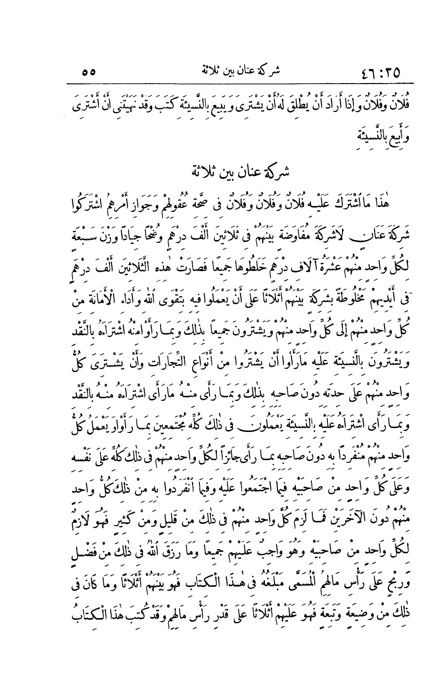 §شَرِكَةُ عَنَانٍ بَيْنَ ثَلَاثَةٍ " هَذَا مَا اشْتَرَكَ عَلَيْهِ فُلَانٌ وَفُلَانٌ، وَفُلَانٌ فِي صِحَّةِ عُقُولِهِمْ، وَجَوَازِ أَمْرِهِمْ، اشْتَرَكُوا شَرِكَةَ عَنَانٍ لَا شَرِكَةَ مُفَاوَضَةٍ بَيْنَهُمْ فِي ثَلَاثِينَ أَلْفَ دِرْهَمٍ وُضْحًا جِيَادًا، وَزْنَ سَبْعَةٍ لِكُلِّ وَاحِدٍ مِنْهُمْ عَشَرَةَ آلَافِ دِرْهَمٍ خَلَطُوهَا جَمِيعًا، فَصَارَتْ هَذِهِ الثَّلَاثِينَ أَلْفَ دِرْهَمٍ فِي أَيْدِيهِمْ مَخْلُوطَةً بِشَرِكَةٍ بَيْنَهُمْ أَثْلَاثًا عَلَى أَنْ يَعْمَلُوا فِيهِ بِتَقْوَى اللَّهِ، وَأَدَاءِ الْأَمَانَةِ، مِنْ كُلِّ وَاحِدٍ مِنْهُمْ إِلَى كُلِّ وَاحِدٍ مِنْهُمْ، وَيَشْتَرُونَ جَمِيعًا بِذَلِكَ، وَبِمَا رَأَوْا مِنْهُ اشْتِرَاءَهُ بِالنَّقْدِ، وَيَشْتَرُونَ بِالنَّسِيئَةِ عَلَيْهِ مَا رَأَوْا أَنْ يَشْتَرُوا مِنْ أَنْوَاعِ التِّجَارَاتِ، وَأَنْ يَشْتَرِيَ كُلُّ وَاحِدٍ مِنْهُمْ عَلَى حِدَتِهِ دُونَ صَاحِبِهِ بِذَلِكَ، وَبِمَا رَأَى مِنْهُ مَا رَأَى اشْتِرَاءَهُ مِنْهُ بِالنَّقْدِ، وَبِمَا رَأَى اشْتِرَاءَهُ عَلَيْهِ بِالنَّسِيئَةِ يَعْمَلُونَ فِي ذَلِكَ كُلِّهِ مُجْتَمِعِينَ بِمَا رَأَوْا، وَيَعْمَلُ كُلُّ وَاحِدٍ مِنْهُمْ مُنْفَرِدًا بِهِ دُونَ صَاحِبِهِ بِمَا رَأَى جَائِزًا لِكُلِّ وَاحِدٍ مِنْهُمْ فِي ذَلِكَ كُلِّهِ عَلَى نَفْسِهِ، وَعَلَى كُلِّ وَاحِدٍ مِنْ صَاحِبَيْهِ فِيمَا اجْتَمَعُوا عَلَيْهِ، وَفِيمَا انْفَرَدُوا بِهِ مِنْ ذَلِكَ كُلُّ وَاحِدٍ مِنْهُمْ دُونَ الْآخَرَيْنِ فَمَا لَزِمَ كُلَّ وَاحِدٍ مِنْهُمْ فِي ذَلِكَ مِنْ قَلِيلٍ، وَمِنْ كَثِيرٍ فَهُوَ لَازِمٌ لِكُلِّ وَاحِدٍ مِنْ صَاحِبَيْهِ وَهُوَ وَاجِبٌ عَلَيْهِمْ جَمِيعًا وَمَا رَزَقَ اللَّهُ فِي ذَلِكَ مِنْ فَضْلٍ وَرِبْحٍ عَلَى رَأْسِ مَالِهِمُ الْمُسَمَّى مَبْلَغُهُ فِي هَذَا الْكِتَابِ، فَهُوَ بَيْنَهُمْ أَثْلَاثًا، وَمَا كَانَ فِي ذَلِكَ مِنْ وَضِيعَةٍ وَتَبِعَةٍ فَهُوَ عَلَيْهِمْ أَثْلَاثًا عَلَى قَدْرِ رَأْسِ مَالِهِمْ، وَقَدْ كُتِبَ هَذَا الْكِتَابُ ثَلَاثَ نُسَخٍ مُتَسَاوِيَاتٍ بِأَلْفَاظٍ: وَاحِدَةٍ فِي يَدِ كُلِّ وَاحِدٍ مِنْ فُلَانٍ وَفُلَانٍ وَفُلَانٍ، وَاحِدَةٌ وَثِيقَةً لَهُ أَقَرَّ فُلَانٌ وَفُلَانٌ وَفُلَانٌ "