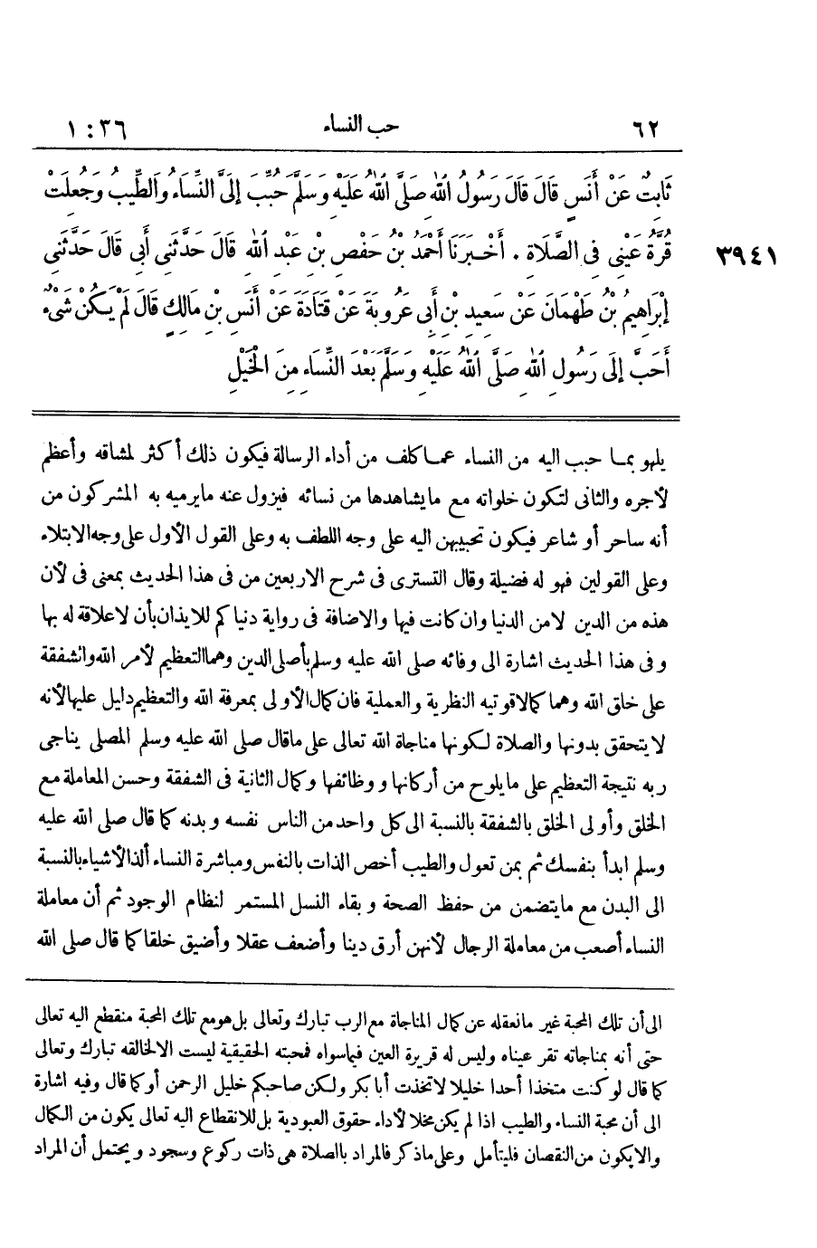 يَلْهُوَ بِمَا حُبِّبَ إِلَيْهِ مِنَ النِّسَاءِ عَمَّا كُلِّفَ مِنْ أَدَاءِ الرِّسَالَةِ فَيَكُونَ ذَلِكَ أَكْثَرَ لِمَشَاقِّهِ وَأَعْظَمَ لِأَجْرِهِ وَالثَّانِي لِتَكُونَ خَلَوَاتُهُ مَعَ مَا يُشَاهِدُهَا مِنْ نِسَائِهِ فَيَزُولَ عَنْهُ مَا يَرْمِيهِ بِهِ الْمُشْرِكُونَ مِنْ أَنَّهُ سَاحِرٌ أَوْ شَاعِرٌ فَيَكُونَ تَحْبِيبُهُنَّ إِلَيْهِ عَلَى وَجْهِ اللُّطْفِ بِهِ وَعَلَى الْقَوْلِ الْأَوَّلِ عَلَى وَجْهِ الِابْتِلَاءِ وَعَلَى الْقَوْلَيْنِ فَهُوَ لَهُ فَضِيلَةٌ وَقَالَ التُّسْتَرِيُّ فِي شَرْحِ الْأَرْبَعِينَ مِنْ فِي هَذَا الْحَدِيثِ بِمَعْنَى فِي لِأَنَّ هَذِهِ مِنَ الدِّينِ لَا مِنَ الدُّنْيَا وَإِنْ كَانَتْ فِيهَا وَالْإِضَافَةُ فِي رِوَايَةِ دنياكم للايذان بِأَن لاعلاقة لَهُ بِهَا وَفِي هَذَا الْحَدِيثِ إِشَارَةٌ إِلَى وَفَائِهِ صَلَّى اللَّهُ عَلَيْهِ وَسَلَّمَ بِأَصْلَيِ الدِّينِ وَهُمَا التَّعْظِيمُ لِأَمْرِ اللَّهِ وَالشَّفَقَةُ عَلَى خَلْقِ اللَّهِ وَهُمَا كَمَالَا قُوَّتَيْهِ النَّظَرِيَّةِ وَالْعَمَلِيَّةِ فَإِنَّ كَمَالَ الْأُولَى بِمَعْرِفَةِ اللَّهِ وَالتَّعْظِيمُ دَلِيلٌ عَلَيْهَا لِأَنَّهُ لَا يَتَحَقَّقُ بِدُونِهَا وَالصَّلَاةُ لِكَوْنِهَا مُنَاجَاةَ اللَّهِ تَعَالَى عَلَى مَا قَالَ صَلَّى اللَّهُ عَلَيْهِ وَسَلَّمَ الْمُصَلِّي يُنَاجِي رَبَّهُ نَتِيجَةُ التَّعْظِيمِ عَلَى مَا يَلُوحُ مِنْ أَرْكَانِهَا وَوَظَائِفِهَا وَكَمَالُ الثَّانِيَةِ فِي الشَّفَقَةِ وَحُسْنِ الْمُعَامَلَةِ مَعَ الْخَلْقِ وَأَوْلَى الْخَلْقِ بِالشَّفَقَةِ بِالنِّسْبَةِ إِلَى كُلِّ وَاحِدٍ مِنَ النَّاسِ نَفْسُهُ وَبَدَنُهُ كَمَا قَالَ صَلَّى اللَّهُ عَلَيْهِ وَسَلَّمَ ابْدَأْ بِنَفْسِكَ ثُمَّ بِمَنْ تَعُولُ وَالطِّيبُ أَخَصُّ الذَّاتِ بِالنَّفْسِ وَمُبَاشَرَةُ النِّسَاءِ أَلَذُّ الْأَشْيَاءِ بِالنِّسْبَةِ إِلَى الْبَدَنِ مَعَ مَا يَتَضَمَّنُ مِنْ حِفْظِ الصِّحَّةِ وَبَقَاءِ النَّسْلِ الْمُسْتَمِرِّ لِنِظَامِ الْوُجُودِ ثُمَّ إِنَّ مُعَامَلَةَ النِّسَاءِ أَصْعَبُ مِنْ مُعَامَلَةِ الرِّجَالِ لِأَنَّهُنَّ أَرَقُّ دِينًا وَأَضْعَفُ عَقْلًا وَأَضْيَقُ خُلُقًا كَمَا قَالَ