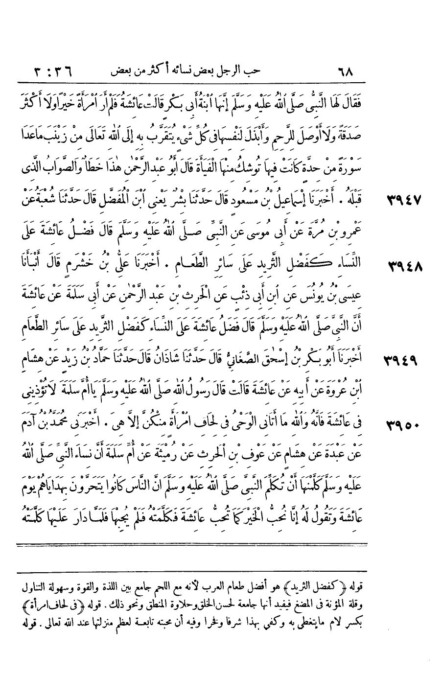 [3947] كفضل الثَّرِيد هُوَ أفضل طَعَام الْعَرَب لِأَنَّهُ مَعَ اللَّحْم جَامع بَين اللَّذَّة وَالْقُوَّة وسهولة التَّنَاوُل وَقلة الْمُؤْنَة فِي المضغ فَيُفِيد أَنَّهَا جَامِعَة لحسن الْخلق وحلاوة الْمنطق وَنَحْو ذَلِك