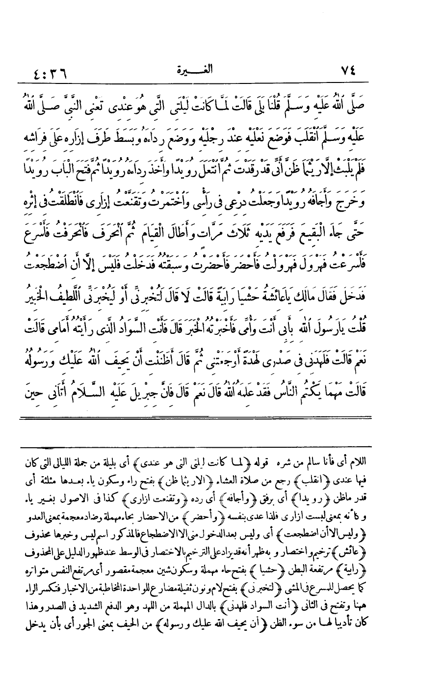 [3964] لما كَانَت لَيْلَتي الَّتِي هُوَ عِنْدِي أَي بليلة من جملَة اللَّيَالِي الَّتِي كَانَ فِيهَا عِنْدِي انْقَلب رَجَعَ من صَلَاة الْعشَاء الا ريثما ظن بِفَتْح رَاء وَسُكُون يَاء بعْدهَا مُثَلّثَة أَي قدر مَا ظن رويدا أَي بِرِفْق وأجافه أَي رده وتقنعت ازاري كَذَا فِي الْأُصُول بِغَيْر يَاء وَكَأَنَّهُ بِمَعْنَى لَبِسْتُ إِزَارِي فَلِذَا عُدِّيَ بِنَفْسِهِ وأحضر من الاحضار بحاء مُهْملَة وضاد مُعْجمَة بِمَعْنى الْعَدو وَلَيْسَ الا أَن اضطجعت أَي وَلَيْسَ بعد الدُّخُول مني الا الِاضْطِجَاع فالمذكور اسْم لَيْسَ وخبرها مَحْذُوف عائش ترخيم واختصار وَبِه ظهر أَنه قد يُزَاد على التَّرْخِيم بالاختصار فِي الْوسط عِنْد ظُهُور الدَّلِيل على الْمَحْذُوف رابية مُرْتَفعَة الْبَطن حشيا بِفَتْح حاء مُهْملَة وَسُكُون شين مُعْجمَة مَقْصُور أَي مُرْتَفع النَّفس متواتره كَمَا يحصل للمسرع فِي الْمَشْي لتخبرني بِفَتْح لَام وَنون ثَقيلَة مضارع للواحدة المخاطبة من الاخبار فتكسر الرَّاء هَا هُنَا وتفتح فِي الثَّانِي أَنْت السوَاد فلهدني بِالدَّال الْمُهْملَة من اللهد وَهُوَ الدّفع الشَّديد فِي الصَّدْر وَهَذَا كَانَ تأديبا لَهَا من سوء الظَّن أَن يَحِيف الله عَلَيْك وَرَسُوله من الحيف بِمَعْنى الْجور أَي بِأَن يدْخل