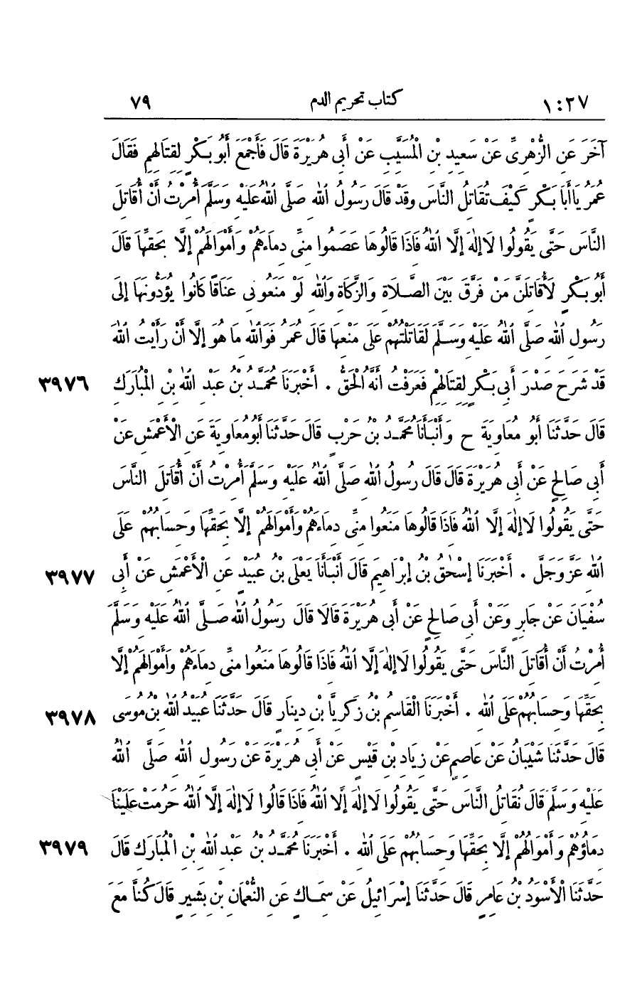 3976 - أَخْبَرَنَا مُحَمَّدُ بْنُ عَبْدِ اللَّهِ بْنِ الْمُبَارَكِ قَالَ: حَدَّثَنَا أَبُو مُعَاوِيَةَ، ح وَأَنْبَأَنَا أَحْمَدُ بْنُ حَرْبٍ قَالَ: حَدَّثَنَا أَبُو مُعَاوِيَةَ، عَنْ الْأَعْمَشِ، عَنْ أَبِي صَالِحٍ، عَنْ أَبِي هُرَيْرَةَ قَالَ: قَالَ رَسُولُ اللَّهِ صَلَّى اللهُ عَلَيْهِ وَسَلَّمَ: " §أُمِرْتُ أَنْ أُقَاتِلَ النَّاسَ حَتَّى يَقُولُوا: لَا إِلَهَ إِلَّا اللَّهُ، فَإِذَا قَالُوهَا مَنَعُوا مِنِّي دِمَاءَهُمْ، وَأَمْوَالَهُمْ إِلَّا بِحَقِّهَا، وَحِسَابُهُمْ عَلَى اللَّهِ عَزَّ وَجَلَّ "