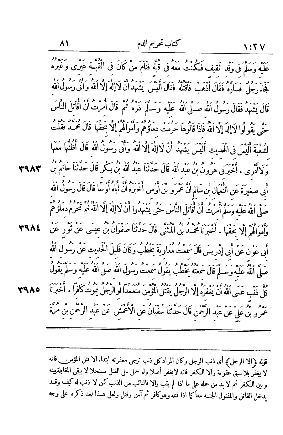 [3984] الا الرجل أَي ذَنْب الرجل وَكَانَ المُرَاد كل ذَنْب ترجى مغفرته ابْتِدَاء الا قتل الْمُؤمن فَإِنَّهُ لَا يغْفر بِلَا سبق عُقُوبَة والا الْكفْر فَإِنَّهُ لَا يغْفر أصلا وَلَو حمل على الْقَتْل مستحلا لَا يبْقى الْمُقَابلَة بَينه وَبَين الْكفْر ثمَّ لَا بُد من حمله على مَا إِذا لم يتب والا فالتائب من الذَّنب كمن لَا ذَنْب لَهُ كَيفَ وَقد يدْخل الْقَاتِل والمقتول الْجنَّة مَعًا كَمَا إِذا قَتله وَهُوَ كَافِر ثمَّ آمن وَقتل وَلَعَلَّ هَذَا بعد ذكره على وَجه