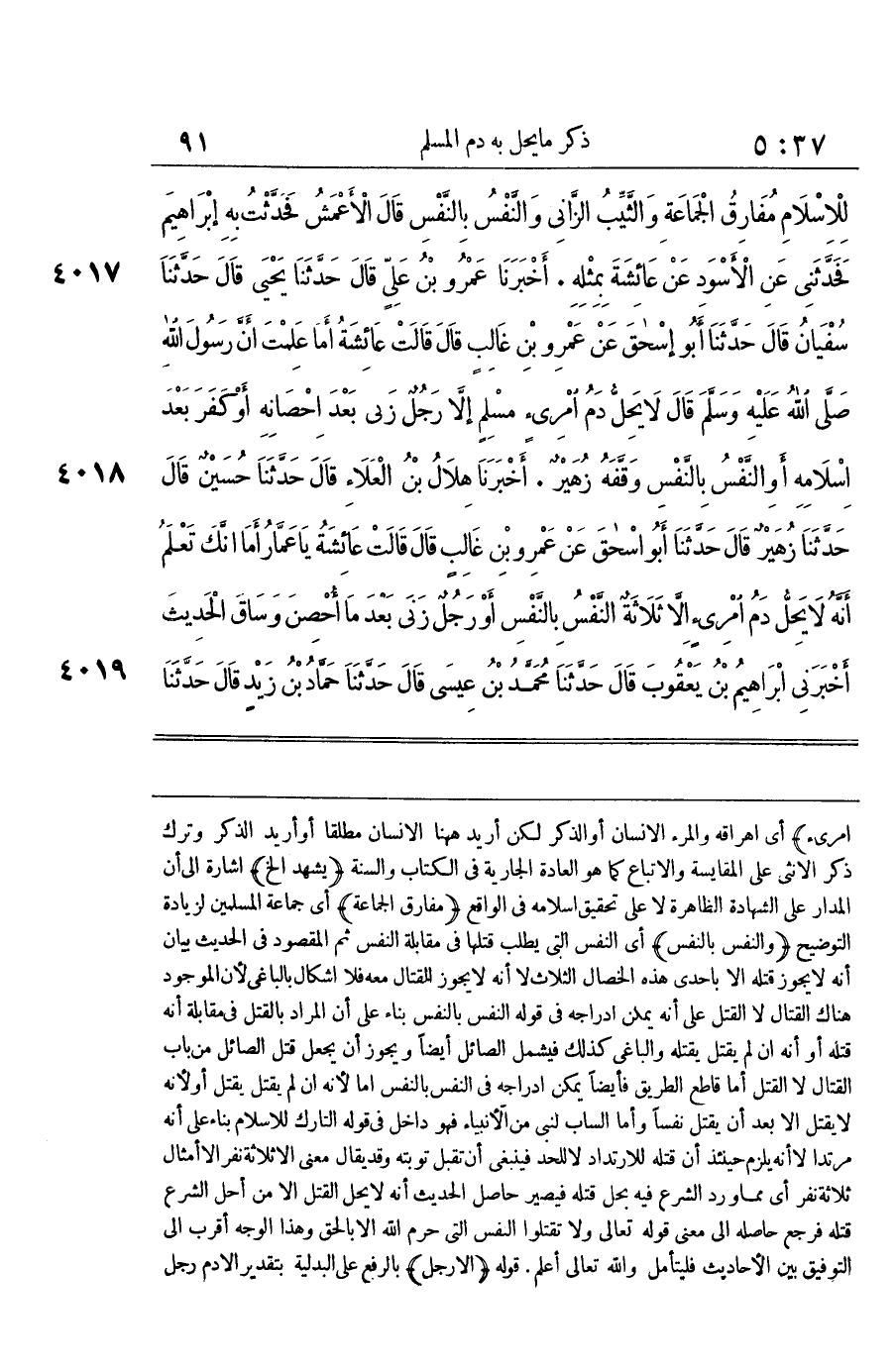 امْرِئ أَي اهراقه والمرء الْإِنْسَان أَو الذّكر لَكِن أُرِيد هَا هُنَا الْإِنْسَان مُطلقًا أَو أُرِيد الذّكر وَترك ذكر الْأُنْثَى على المقايسة والاتباع كَمَا هُوَ الْعَادة الْجَارِيَة فِي الْكتاب وَالسّنة يشْهد الخ إِشَارَة إِلَى أَن الْمدَار على الشَّهَادَة الظَّاهِرَة لَا على تَحْقِيق إِسْلَامه فِي الْوَاقِع مفارق الْجَمَاعَة أَي جمَاعَة الْمُسلمين لزِيَادَة التَّوْضِيح وَالنَّفس بِالنَّفسِ أَي النَّفس الَّتِي يطْلب قَتلهَا فِي مُقَابلَة النَّفس ثمَّ الْمَقْصُود فِي الحَدِيث بَيَان أَنه لَا يجوز قَتله الا بِإِحْدَى هَذِه الْخِصَال الثَّلَاث لَا أَنه لَا يجوز الْقِتَال مَعَه فَلَا اشكال بالباغي لِأَن الْمَوْجُود هُنَاكَ الْقِتَال لَا الْقَتْل على أَنه يُمكن ادراجه فِي قَوْله النَّفس بِالنَّفسِ بِنَاء على أَن المُرَاد بِالْقَتْلِ فِي مُقَابلَة أَنه قَتله أَو أَنه ان لم يقتل قَتله والباغي كَذَلِك فَيشْمَل الصَّائِل أَيْضا وَيجوز أَن يَجْعَل قتل الصَّائِل من بَاب الْقِتَال لَا الْقَتْل أما قَاطع الطَّرِيق فأيضا يُمكن ادراجه فِي النَّفس بِالنَّفسِ اما لِأَنَّهُ ان لم يقتل يقتل أَو لِأَنَّهُ لَا يقتل الا بعد أَن يقتل نفسا وَأما الساب لنَبِيّ من الْأَنْبِيَاء فَهُوَ دَاخل فِي قَوْله التارك لِلْإِسْلَامِ بِنَاء على أَنه مُرْتَدا لَا أَنه يلْزم حِينَئِذٍ أَن قَتله للارتداد لَا للحد فَيَنْبَغِي أَن تقبل تَوْبَته وَقد يُقَال معنى الا ثَلَاثَة نفر الا أَمْثَال ثَلَاثَة نفر أَي مِمَّا ورد الشَّرْع فِيهِ بِحل قَتله فَيصير حَاصِل الحَدِيث أَنه لَا يحل الْقَتْل الا من أحل الشَّرْع قَتله فَرجع حَاصله إِلَى معنى قَوْله تَعَالَى وَلَا تَقْتُلُوا النَّفْسَ الَّتِي حَرَّمَ اللَّهُ إِلَّا بِالْحَقِّ وَهَذَا الْوَجْه أقرب إِلَى التَّوْفِيق بَين الْأَحَادِيث فَلْيتَأَمَّل وَالله تَعَالَى أعلم قَوْله الأرجل بِالرَّفْع على الْبَدَلِيَّة بِتَقْدِير الادم رجل
