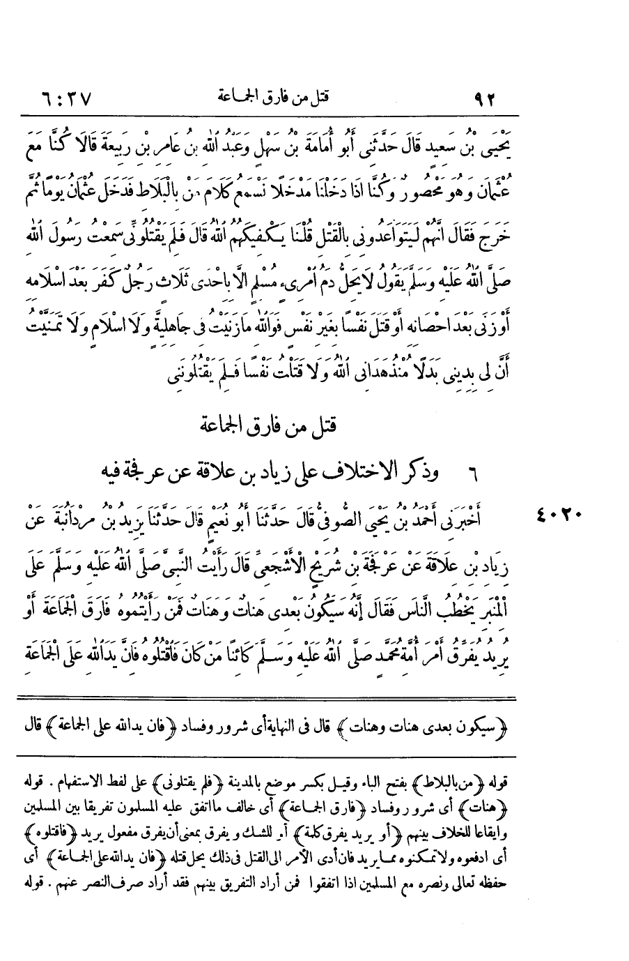 [4019] من بالبلاط بِفَتْح الْبَاء وَقيل بِكَسْر مَوضِع بِالْمَدِينَةِ فَلم يقتلوني على لفظ الِاسْتِفْهَام قَوْله هنأت أَي شرور وَفَسَاد فَارق الْجَمَاعَة أَي خَالف مَا اتّفق عَلَيْهِ الْمُسلمُونَ تفريقا بَين الْمُسلمين وإيقاعا للْخلاف بَينهم أَو يُرِيد يفرق كلمة أَو للشَّكّ وَيفرق بِمَعْنى أَن يفرق مفعول يُرِيد فَاقْتُلُوهُ أَي ادفعوه وَلَا تمكنوه مِمَّا يُرِيد فان أدّى الْأَمر إِلَى الْقَتْل فِي ذَلِك يحل قَتله فَإِن يَد الله على الْجَمَاعَة أَي حفظه تَعَالَى وَنَصره مَعَ الْمُسلمين إِذا اتَّفقُوا فَمن أَرَادَ التَّفْرِيق بَينهم فقد أَرَادَ صرف النَّصْر عَنْهُم قَوْله