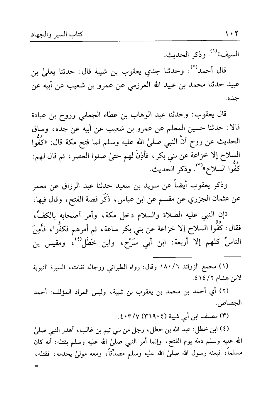 قال أحمد: وحدثنا جدي يعقوب بن شيبة قال: حدثنا يعلى بن عبيد حدثنا محمد بن عبيد الله العرزمي عن عمرو بن شعيب عن أبيه عن جده.