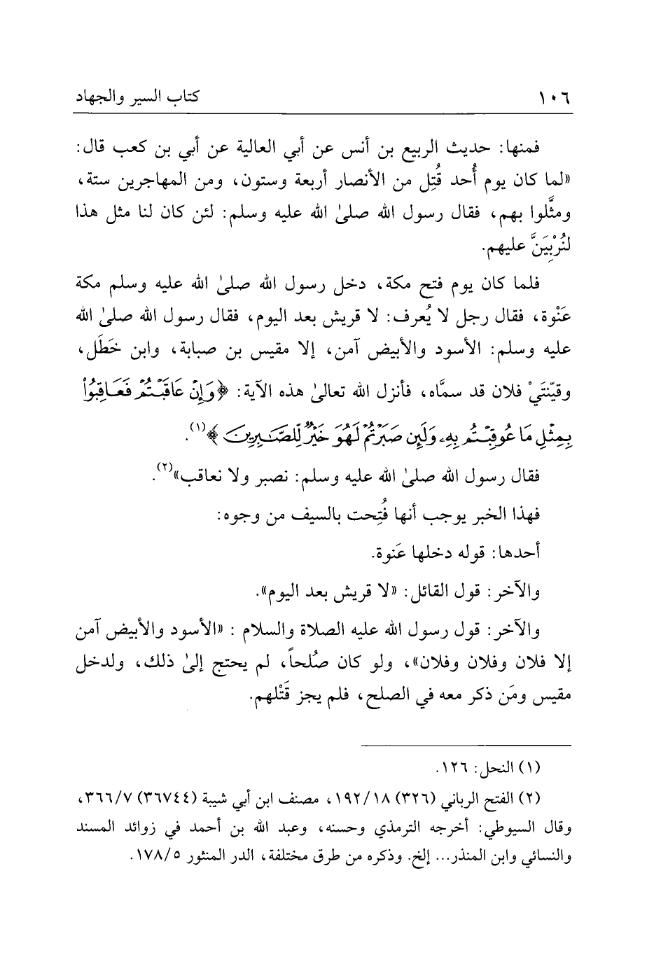 فمنها: حديث بن أنس عن أبي العالية عن أبي بن كعب قال: "لما كان يوم أحد قتل من الأنصار أربعة وستون، ومن المهاجرين ستة، ومثلوا بهم، فقال رسول الله صلى الله عليه وسلم: لئن كان لنا مثل هذا لنربين عليهم.