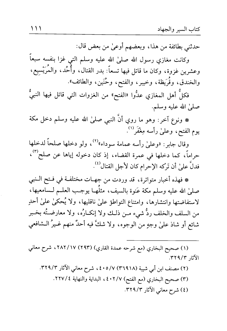 *فهذه أخبار متواترة، قد وردت من جهات مختلفة في فتح النبي صلى الله عليه وسلم مكة عنوة بالسيف، مثلها يوجب العلم لسامعيها، لاستفاضتها وانتشارها، وامتناع التواطؤ على ناقليها، ولا يحكى على أحد من السلف والخلف رد شيء من ذلك ولا إنكاره، ولا معارضته بخبر شائع أو شاذ على وجه من الوجوه، ولا شك فيه أحد منهم غير الشافعي