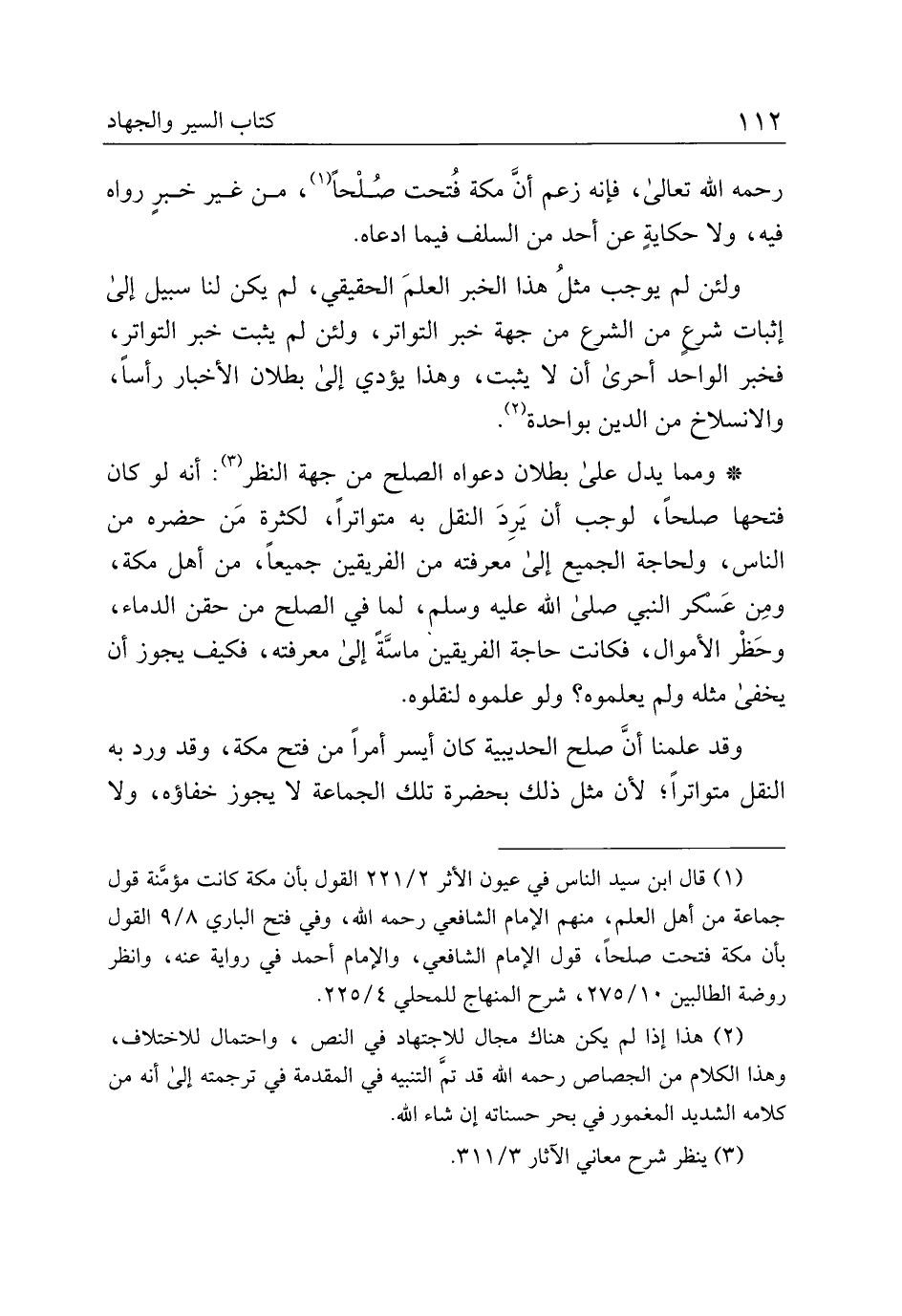 رحمه الله تعالى، فإنه زعم أن مكة فتحت صلحا، من غير خبر رواه فيه، ولا حكاية عن أحد من السلف فيما ادعاه.