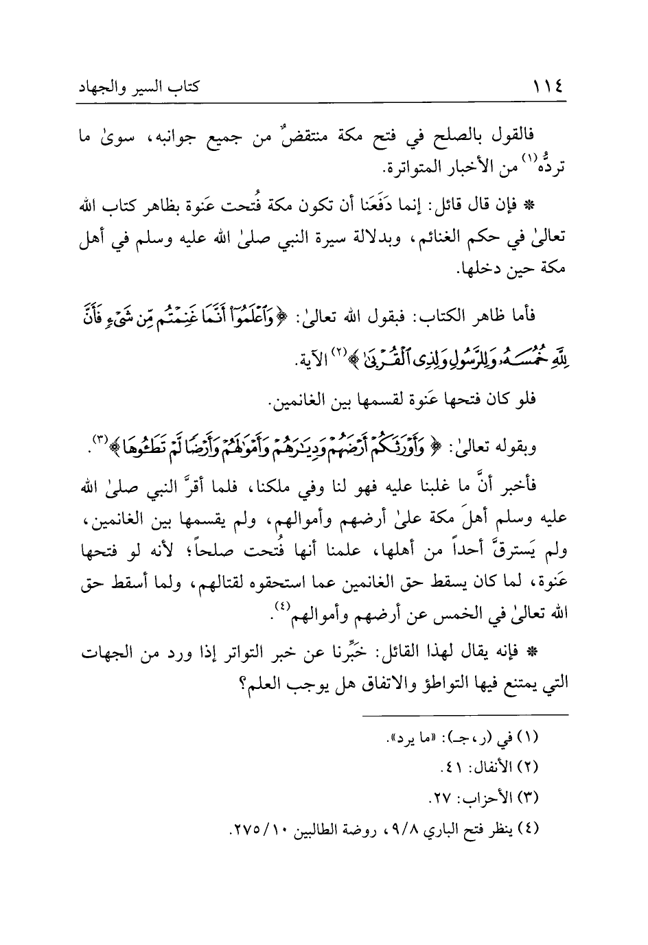 *فإن قال قائل: إنما دفعنا أن تكون مكة فتحت عنوة بظاهر كتاب الله تعالى في حكم الغنائم، وبدلالة سيرة النبي صلى الله عليه وسلم في أهل مكة حين دخلها.