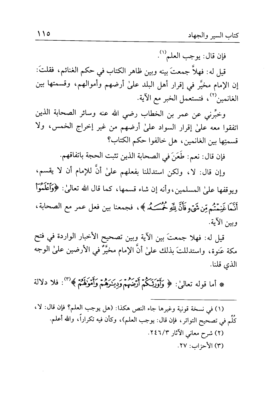 قيل له: فهلا جمعت بينه وبين ظاهر الكتاب في حكم الغنائم، فقلت إن الإمام مخير في إقرار أهل البلد على أرضهم وأموالهم، وقسمتها بين الغانمين، فتستعمل الخبر مع الآية.