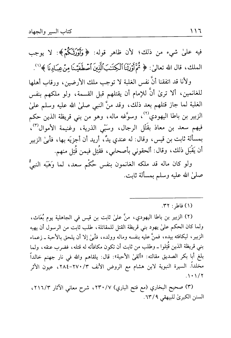 ولأنا قد اتفقنا أن نفس الغلبة لا توجب ملك الأرضين، ورقاب أهلها للغانمين، ألا ترى أن للإمام أن يقتلهم قبل القسمة، ولو ملكهم بنفس الغلبة لما جاز قتلهم بعد ذلك، وقد من النبي صلى الله عليه وسلم على الزبير بن باطا اليهودي، وسوغه ماله، وهو من بني قريظة الذين حكم فيهم سعد بن معاذ بقتل الرجال، وسبي الذرية، وغنيمة الأموال، بمسألة ثابت بن قيس، وقال: له عندي يد، أريد أن أجزيه بها، فأبى الزبير أن يقبل ذلك، وقال: ألحقوني بأصحابي، فقتل فيمن قتل منهم.