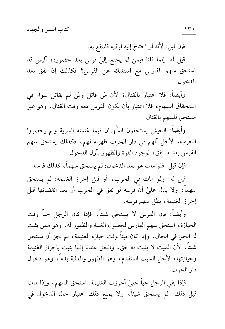 قيل له: إنما قلنا فيمن لم يحتج إلى فرس بعد حضوره، أليس قد استحق سهم الفارس مع استغنائه عن الفرس؟ فكذلك إذا نفق بعد الدخول.