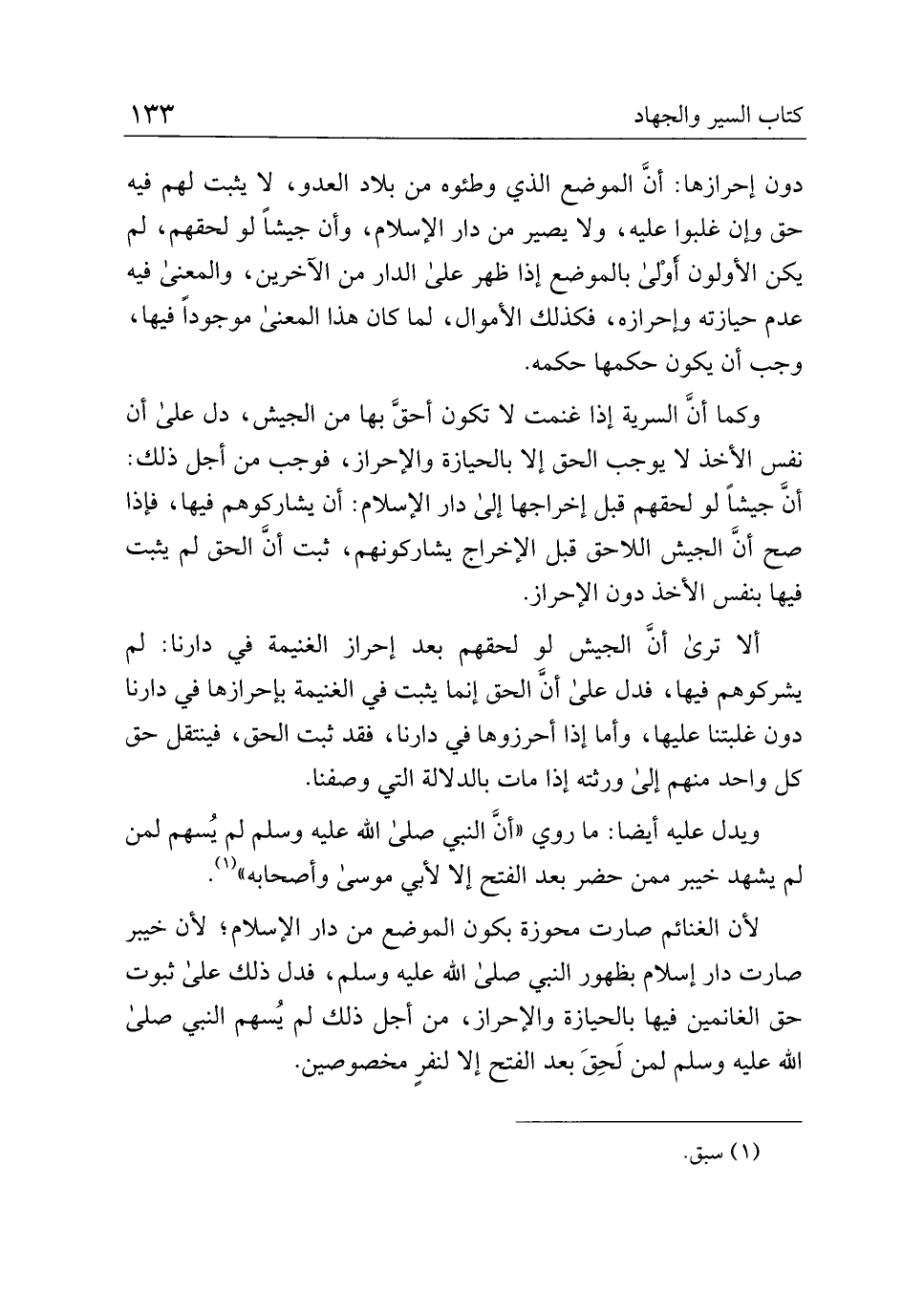 دون إحرازها: أن الموضع الذي وطئوه من بلاد العدو، لا يثبت لهم فيه حق وإن غلبوا عليه، ولا يصير من دار الإسلام، وأن جيشا لو لحقهم، لم يكن الأولون أولى بالموضع إذا ظهر على الدار من الآخرين، والمعنى فيه عدم حيازته وإحرازه، فكذلك الأموال، لما كان هذا المعنى موجودا فيها، وجب أن يكون حكمها حكمه.