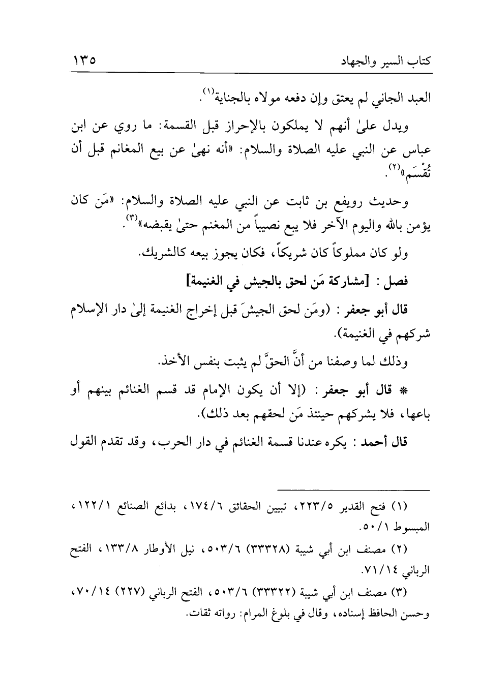 *قال أبو جعفر: (إلا أن يكون الإمام قد قسم الغنائم بينهم أو باعها، فلا يشركهم حينئذ من لحقهم بعد ذلك).
