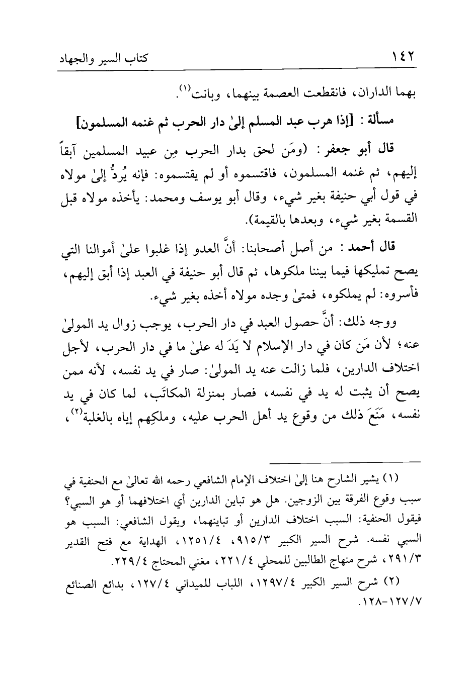 قال أبو جعفر: (ومن لحق بدار الحرب من عبيد المسلمين آبقا إليهم، ثم غنمه المسلمون، فاقتسموه أو لم يقتسموه: فإنه يرد إلى مولاه في قول أبي حنيفة بغير شيء، وقال أبو يوسف ومحمد: يأخذه مولاه قبل القسمة بغير شيء، وبعدها بالقيمة).