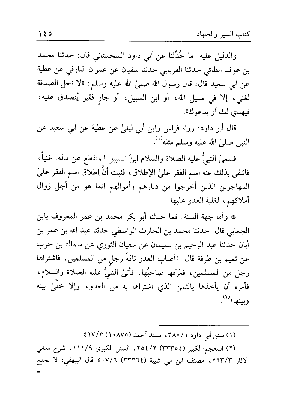 والدليل عليه: ما حدثنا عن أبي داود السجستاني قال: حدثنا محمد بن عوف الطائي حدثنا الفريابي حدثنا سفيان عن عمران البارقي عن عطية عن أبي سعيد قال: قال رسول الله صلى الله عليه وسلم: "لا تحل الصدقة لغني، إلا في سبيل الله، أو ابن السبيل، أو جار فقير يتصدق عليه، فيهدي لك أو يدعوك".