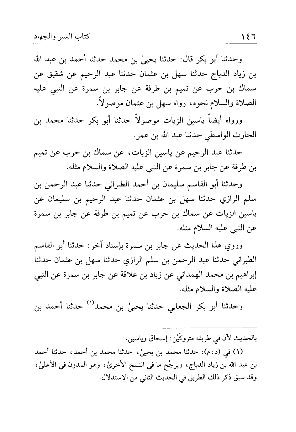 وحدثنا أبو بكر قال: حدثنا يحيى بن محمد حدثنا أحمد بن عبد الله بن زياد الدباج حدثنا سهل بن عثمان حدثنا عبد الرحيم عن شفيق عن سماك بن حرب عن تميم بن طرفة عن جابر بن سمرة عن النبي عليه الصلاة والسلام نحوه، رواه سهل بن عثمان موصولا.