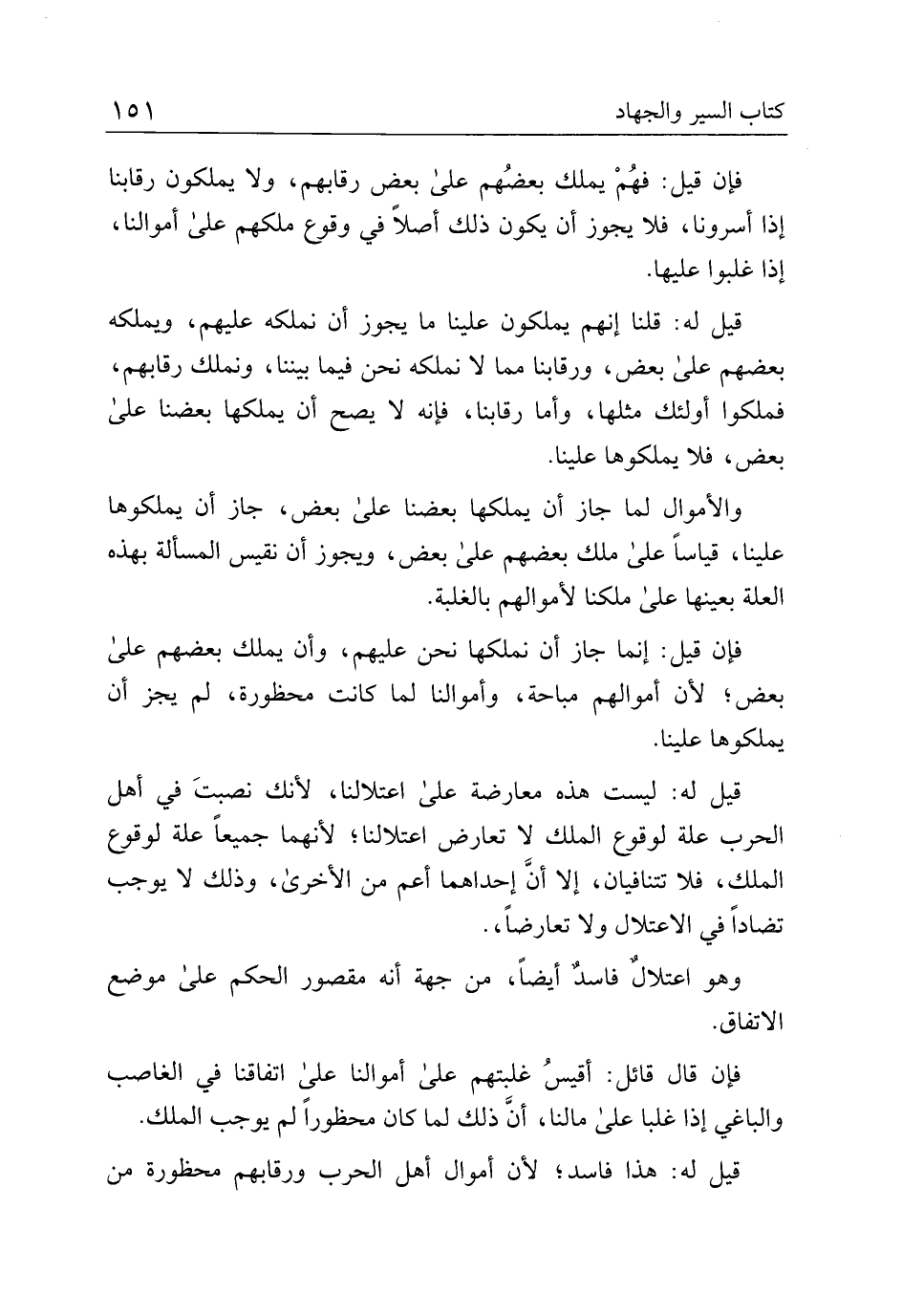 قيل له: قلنا إنهم يملكون علينا ما يجوز أن نملكه عليهم، ويملكه بعضهم على بعض، ورقابنا مما لا نملكه نحن فيما بيننا، ونملك رقابهم، فملكوا أولئك مثلها، وأما رقابنا، فإنه لا يصح أن يملكها بعضنا على بعض، فلا يملكوها علينا.