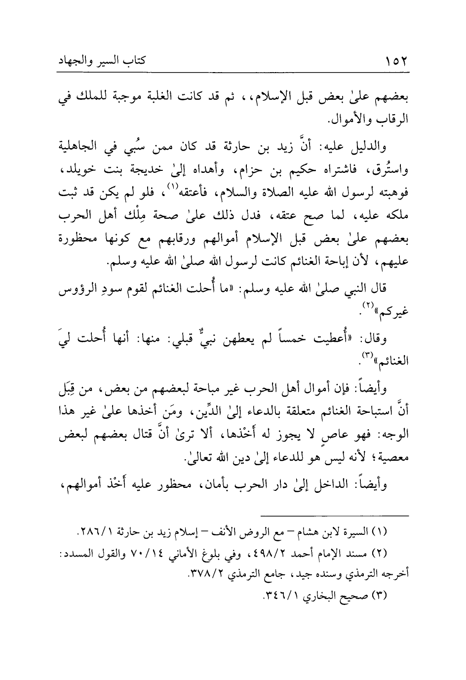 والدليل عليه: أن زيد بن حارثة قد كان ممن سبي في الجاهلية واسترق، فاشتراه حكيم بن حزام، وأهداه إلى خديجة بنت خويلد، فوهبته لرسول الله عليه الصلاة والسلام، فأعتقته، فلو لم يكن قد ثبت ملكه عليه، لما صح عتقه، فدل ذلك على صحة ملك أهل الحرب بعضهم على بعض قبل الإسلام أموالهم ورقابهم مع كونها محظورة عليهم، لأن إباحة الغنائم كانت لرسول الله صلى الله عليه وسلم.