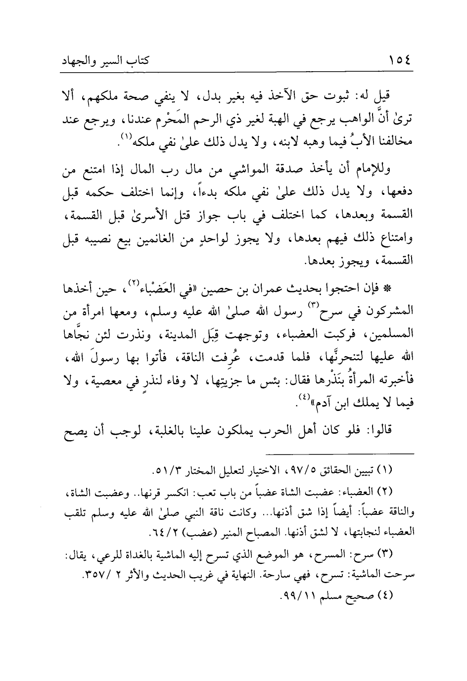*فإن احتجوا بحديث عمران بن حصين "في العضباء، حين أخذها المشركون في سرح رسول الله صلى الله عليه وسلم، ومعها امرأة من المسلمين، فركبت العضباء، وتوجهت قبل المدينة، ونذرت لئن نجاها الله عليها لتنحرنها، فلما قدمت، عرفت الناقة، فأتوا بها رسول الله، فأخبرته المرأة بنذرها فقال: بئس ما جزيتها، لا وفاء لنذر في معصية، ولا فيما لا يملك ابن آدم".