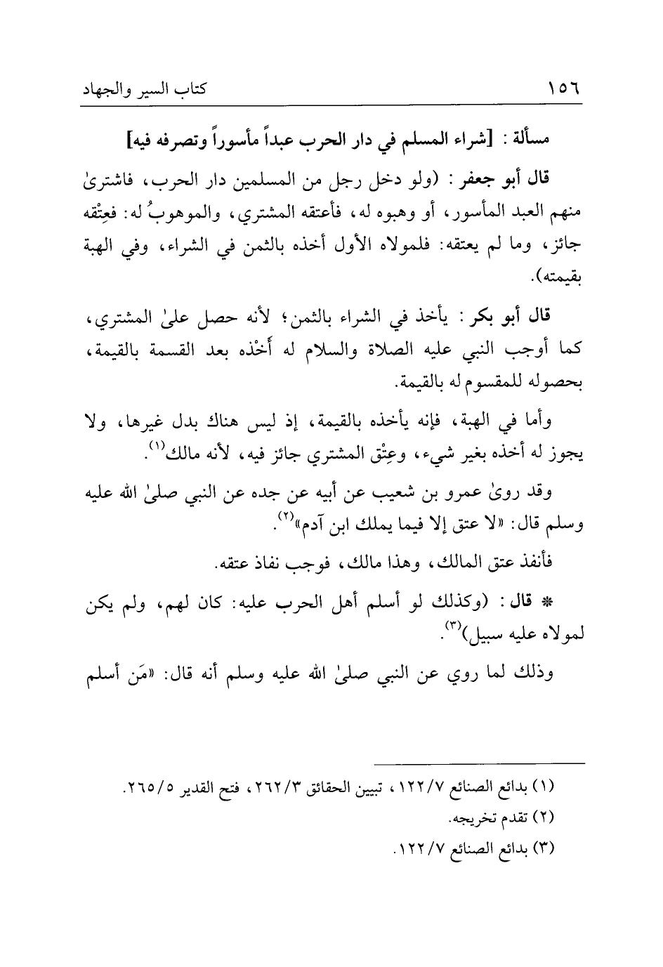 قال أبو جعفر: (ولو دخل رجل من المسلمين دار الحرب، فاشترى منهم العبد المأسور، أو وهبوه له، فأعتقه المشتري، والموهوب له: فعتقه جائز، وما لم يعتقه: فلمولاه الأول أخذه بالثمن في الشراء، وفي الهبة بقيمته).