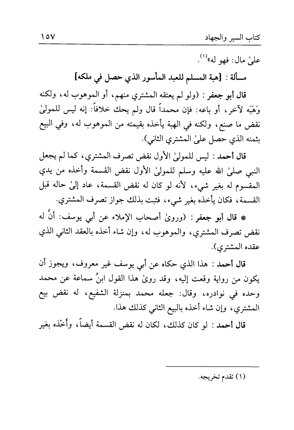 قال أحمد: ليس للمولى الأول نقض تصرف المشتري، كما لم يجعل النبي صلى الله عليه وسلم للمولى الأول نقض القسمة وأخذه من يدي المقسوم له بغير شيء، لأنه لو كان له نقض القسمة، عاد إلى حاله قبل القسمة، فكان يأخذه بغير شيء، فثبت بذلك جواز تصرف المشتري.