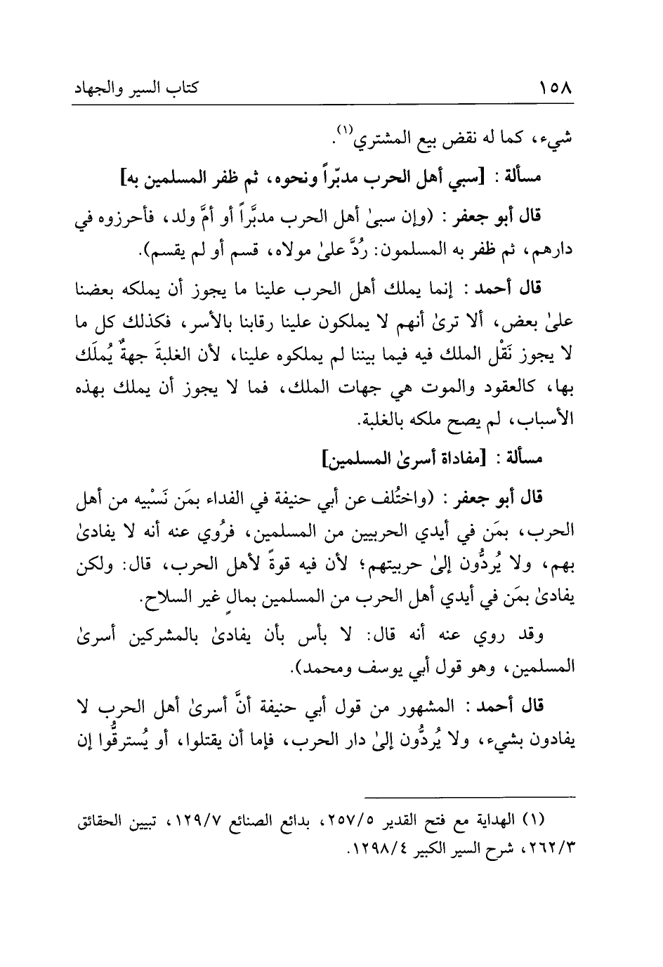 قال أبو جعفر: (واختلف عن أبي حنيفة في الفداء بمن نسبيه من أهل الحرب، بمن في أيدي الحربيين من المسلمين، فروي عنه أنه لا يفادى بهم، ولا يردون إلى حربيتهم؛ لأن فيه قوة لأهل الحرب، قال: ولكن يفادى بمن في أيدي أهل الحرب من المسلمين بمال غير السلاح.