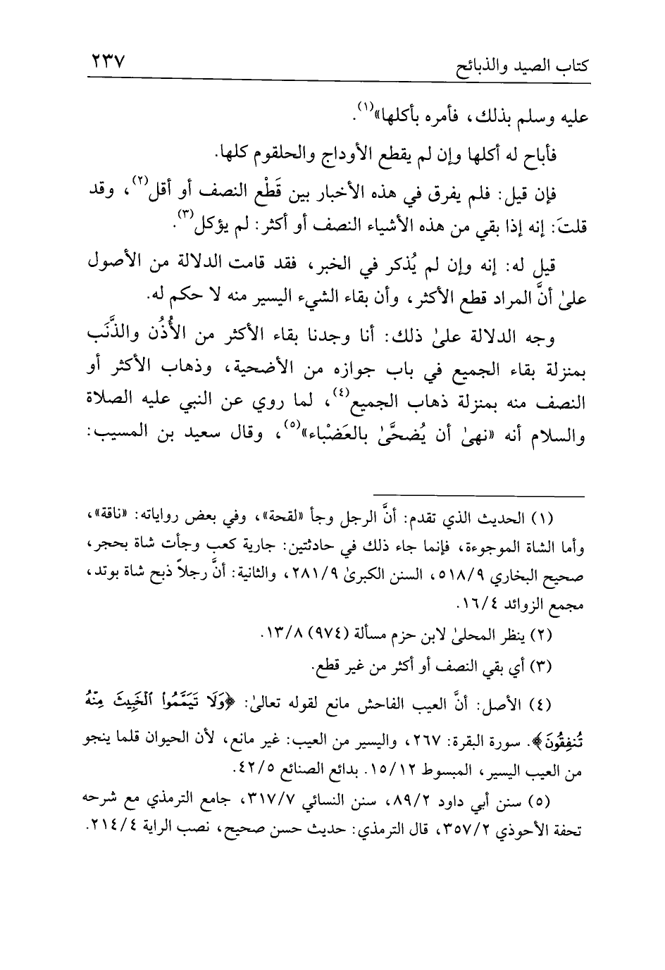 وجه الدلالة على ذلك: أنا وجدنا بقاء الأكثر من الأذن والذنب بمنزلة بقاء الجميع في باب جوازه من الأضحية، وذهاب الأكثر أو النصف منه بمنزلة ذهاب الجميع، لما روي عن النبي عليه الصلاة والسلام أنه: "نهى أن يُضحَّى بالعضباء"، وقال سعيد بن المسيب: