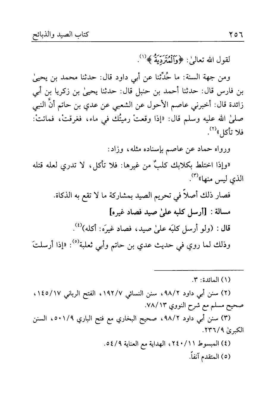 ومن جهة السنة: ما حدثنا عن أبي داود قال: حدثنا محمد بن يحي بن فارس قال: حدثنا أحمد بن حنبل قال: حدثنا يحي بن زكريا بن أبي زائدة قال: أخبرني عاصم الأحول عن الشعبي عن عدي بن حاتم أن النبي صلى الله عليه وسلم قال: "إذا وقعت رميتك في ماء، فغرقت، فماتت: فلا تأكل".
