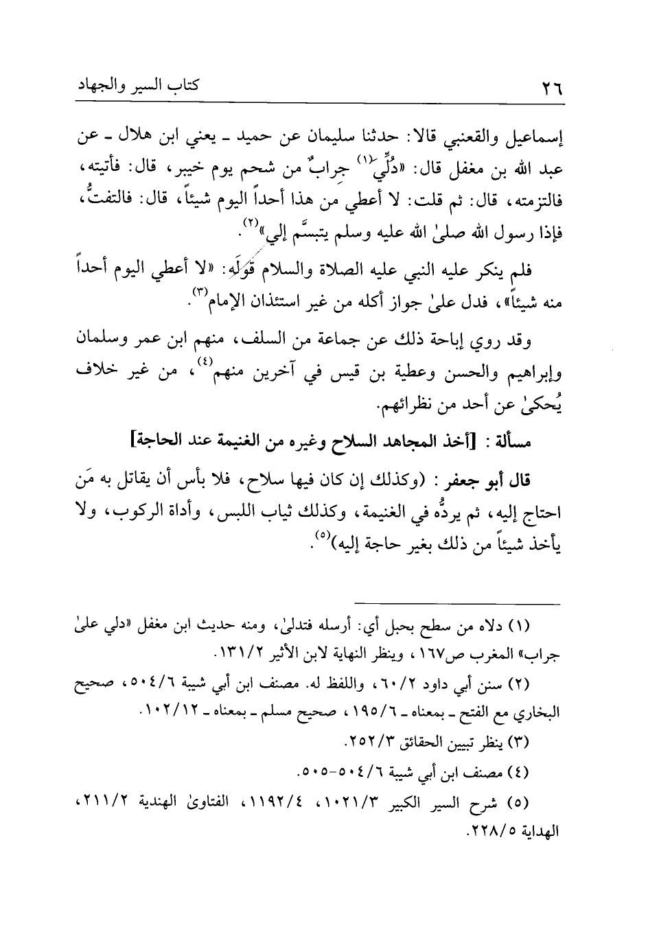 قال أبو جعفر: (وكذلك إن كان فيها سلاح، فلا بأس أن يقاتل به من احتاج إليه، ثم يرده في الغنيمة، وكذلك ثياب اللبس، وأداة الركوب، ولا يأخذ شيئًا من ذلك بغير حاجة إليه).