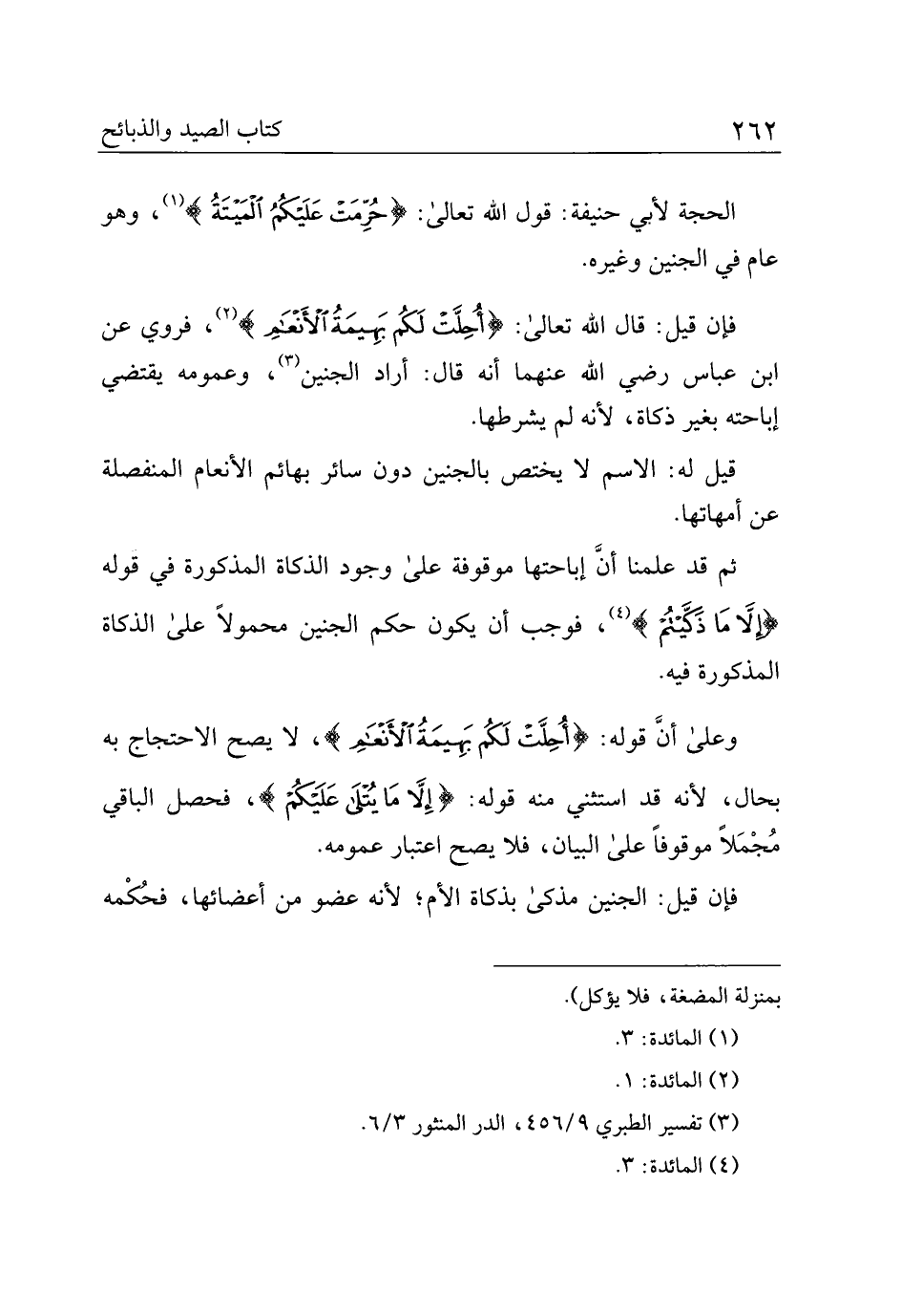 ثم قد علمنا أنَّ إباحتها موقوفة على وجود الذكاة المذكورة في قوله {إلا ما ذكيتم}، فوجب أن يكون حكم الجنين محمولاً على الذكاة المذكورة فيه.