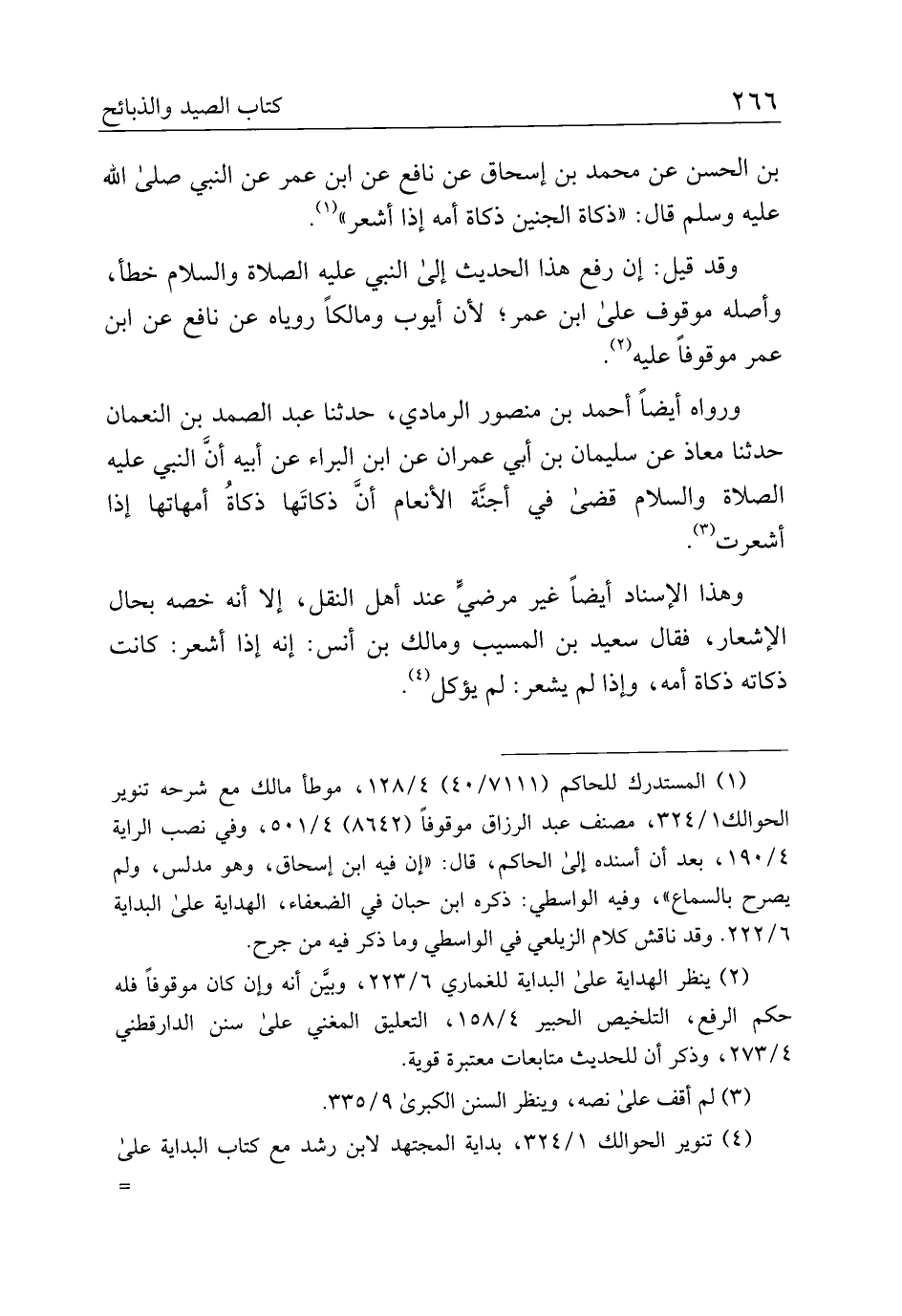 وهذا الإسناد أيضًا غير مرضيٍّ عند أهل النقل، إلا أنه خصه بحال الإشعار، فقال سعيد بن المسيب ومالك بن أنس: إنه إذا أشعر: كانت ذكاته ذكاة أمه، وإذا لم يشعر: لم يؤكل.