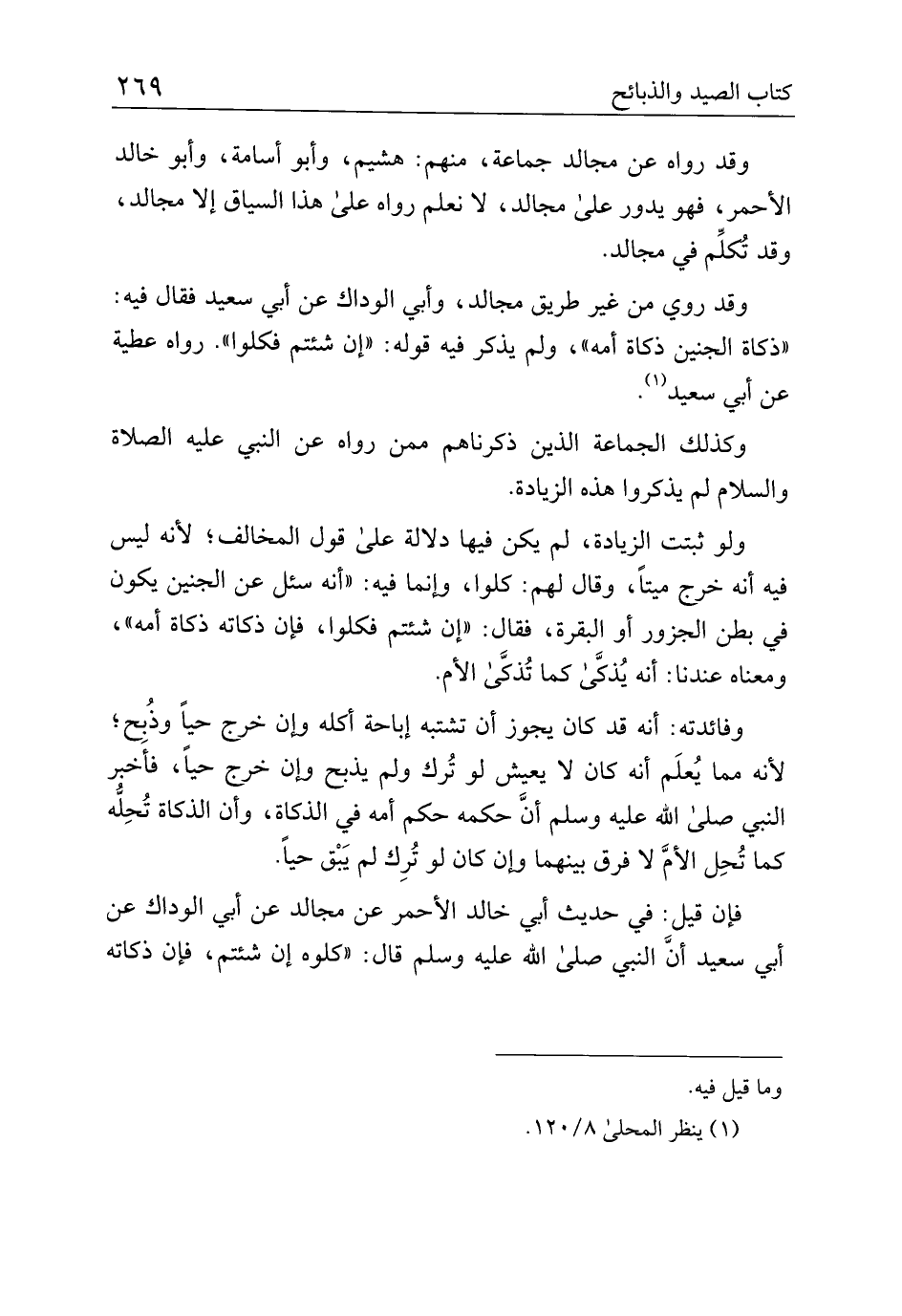 ولو ثبتت الزيادة، لم يكن فيها دلالة على قول المخالف؛ لأنه ليس فيه أنه خرج ميتًا، وقال لهم: كلوا، وإنما فيه: "أنه سئل عن الجنين يكون في بطن الجزور أو البقرة، فقال: "إن شئتم فكلوا، فإن ذكاته ذكاة أمه"، ومعناه عندنا: أنه يذكى كما تذكى الأم.