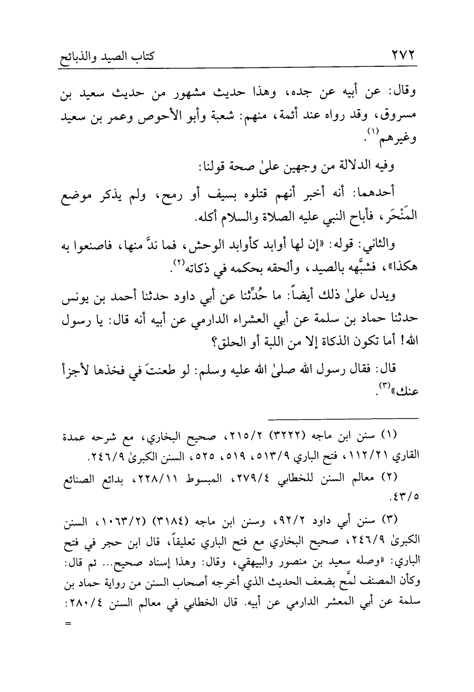 ويدل على ذلك أيضًا: ما حدثنا عن أبي داود حدثنا أحمد بن يونس حدثنا حماد بن سلمة عن أبي العشراء الدارمي عن أبيه أنه قال: يا رسول الله! أما تكون الذكاة إلا من اللبة أو الحلق؟