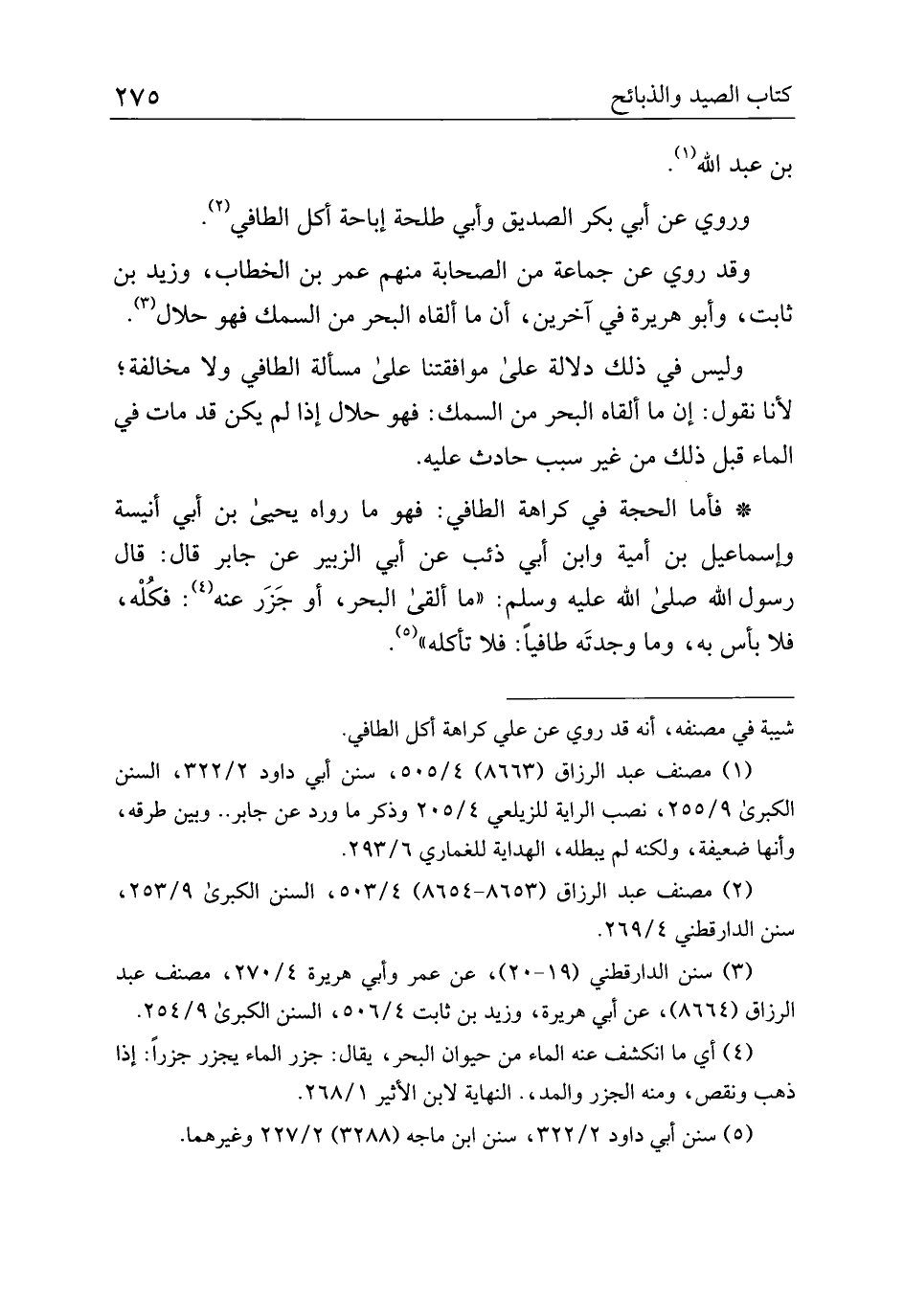 * فأما الحجة في كراهة الطافي: فهو ما رواه يحيى بن أبي أنيسة وإسماعيل بن أمية وابن أبي ذئب عن أبي الزبير عن جابر قال: قال رسول الله صلى الله عليه وسلم: "ما ألقى البحر، أو جزر عنه: فكله، فلا بأس به، وما وجدته طافيًا: فلا تأكله".