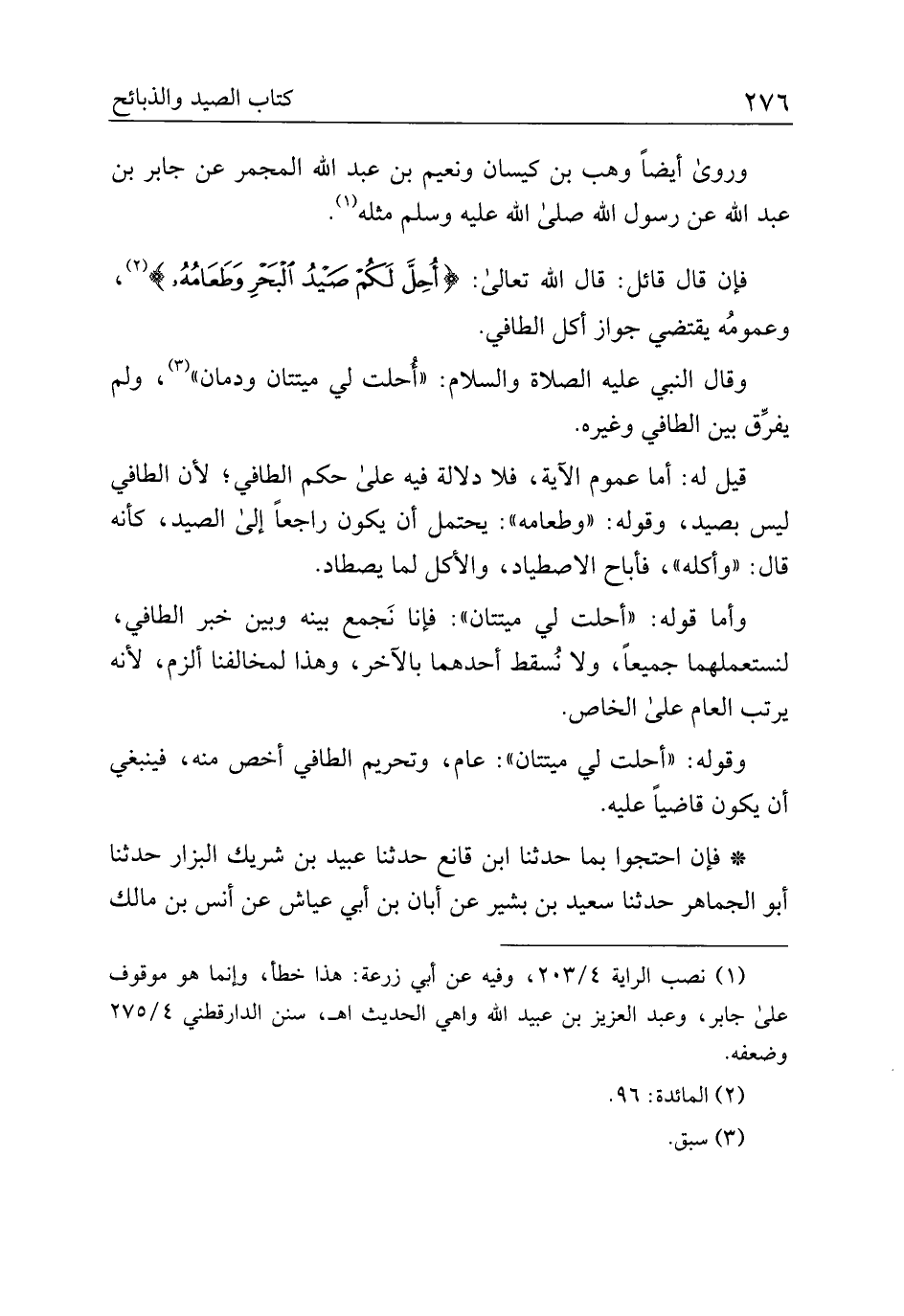 وأما قوله: "أحلت لي ميتتان": فإنا نجمع بينه وبين خبر الطافي، لنستعملهما جميعًا، ولا نسقط أحدهما بالآخر، وهذا لمخالفنا ألزم، لأنه يرتب العام على الخاص.