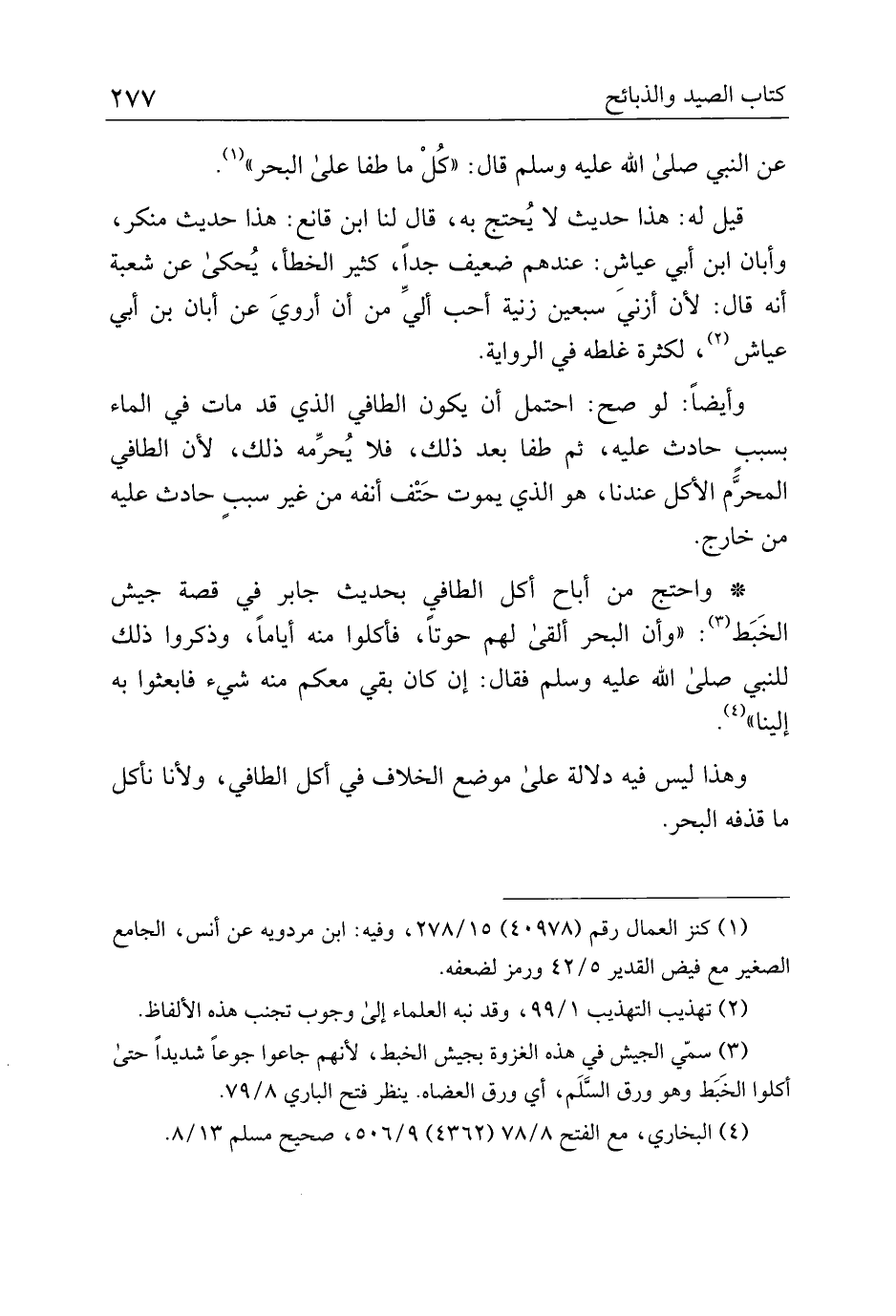وأيضًا: لو صح: احتمل أن يكون الطافي الذي قد مات في الماء بسبب حادث عليه، ثم طفا بعد ذلك، فلا يُحرمه ذلك، لأن الطافي المحرِّم الأكل عندنا، هو الذي يموت حتف أنفه من غير سببٍ حادث عليه من خارج.