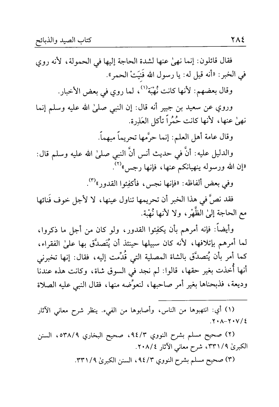 وأيضًا: فإنه أمرهم بأن يكفئوا القدور، ولو كان من أجل ما ذكروا، لما أمرهم بإتلافها، لأنه كان سبيلها حينئذ أن يُتصدق بها على الفقراء، كما أمر بأن يتصدق بالشاة المصلية التي قُدمت إليه، فقال: إنها تخبرني أنها أُخذت بغير حقها، قالوا: لم نجد في السوق شاة، وكانت هذه عندنا وديعة، فذبحناها بغير أمر صاحبها، لنعوضه منها، فقال النبي عليه الصلاة