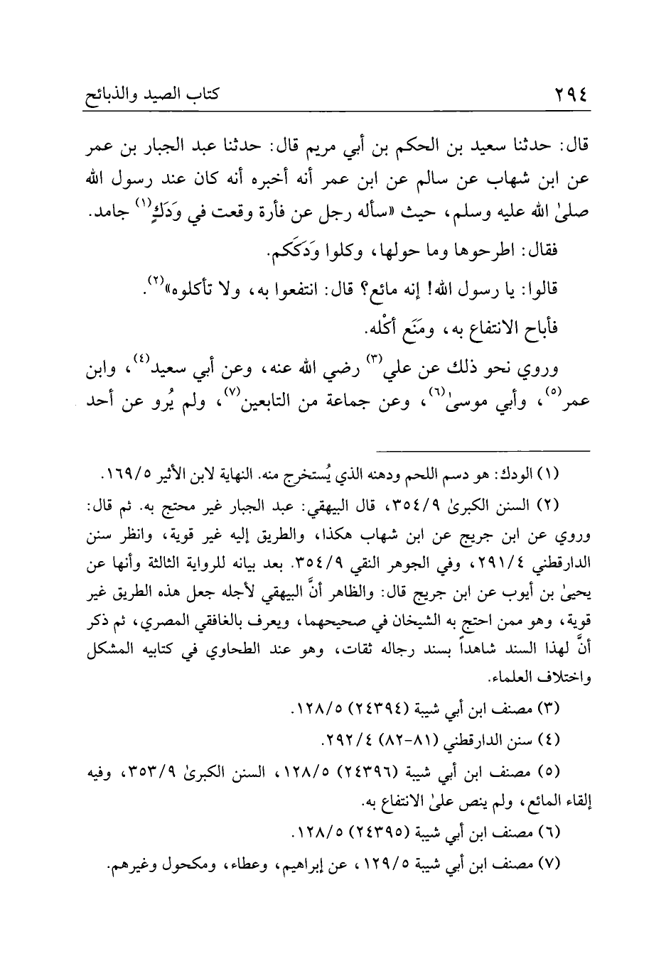 قال: حدثنا سعيد بن الحكم بن أبى مريم قال: حدثنا عبد الجبار بن عمر عن ابن شهاب عن سالم عن ابن عمر أنه أخبره أنه كان عند رسول الله صلى الله عليه وسلم، حيث "سأله رجل عن فأرة وقعت في ودك جامد.