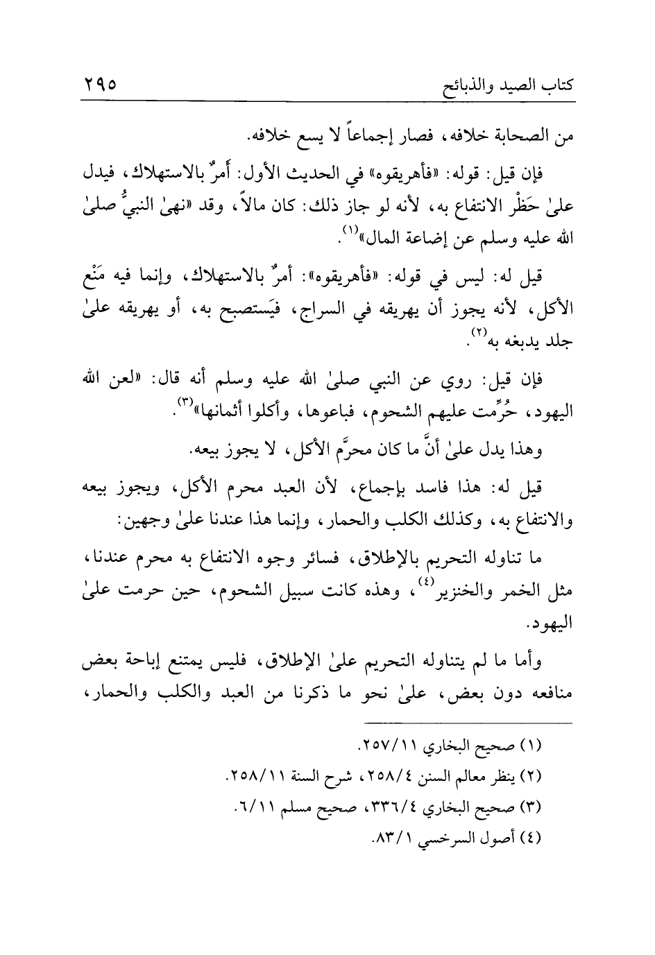 ما تناوله التحريم بالإطلاق، فسائر وجوه الانتفاع به محرم عندنا، مثل الخمر والخنزير، وهذه كانت سبيل الشحوم، حين حرمت على اليهود.