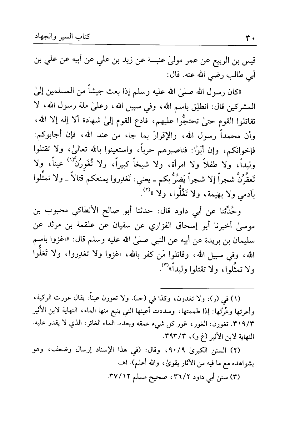 "كان رسول الله صلى الله عليه وسلم إذا بعث جيشًا من المسلمين إلى المشركين قال: انطلق باسم الله، وفي سبيل الله، وعلى ملة رسول الله، لا تقاتلوا القوم حتى تحتجوا عليهم، فادع القوم إلى شهادة ألا إله إلا الله، وأن محمدًا رسول الله، والإقرار بما جاء من عند الله، فإن أجابوكم: فإخوانكم، وإن أبوا: فناصبوهم حربًا، واستعينوا بالله تعالى، ولا تقتلوا وليدًا، ولا طفلًا ولا امرأة، ولا شيخًا كبيرًا، ولا تغورن عينًا، ولا تعقرن شجرًا إلا شجرًا يضر بكم- يعني: تغدروا يمنعكم قتالًا- ولا تمثلوا بآدمي ولا بهيمة، ولا تغلوا، ولا".