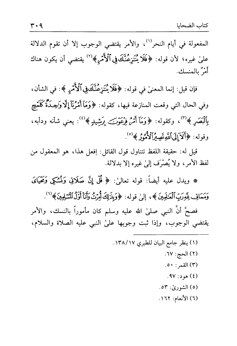 المفعولة في أيام النحر، والأمر يقتضي الوجوب إلا أن تقوم الدلالة على غيره؛ لأن قوله:} فلا ينازعنك في الأمر {يقتضي أن يكون هناك أمر بالمنسك.